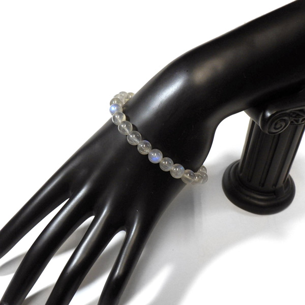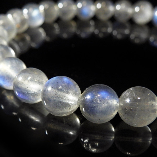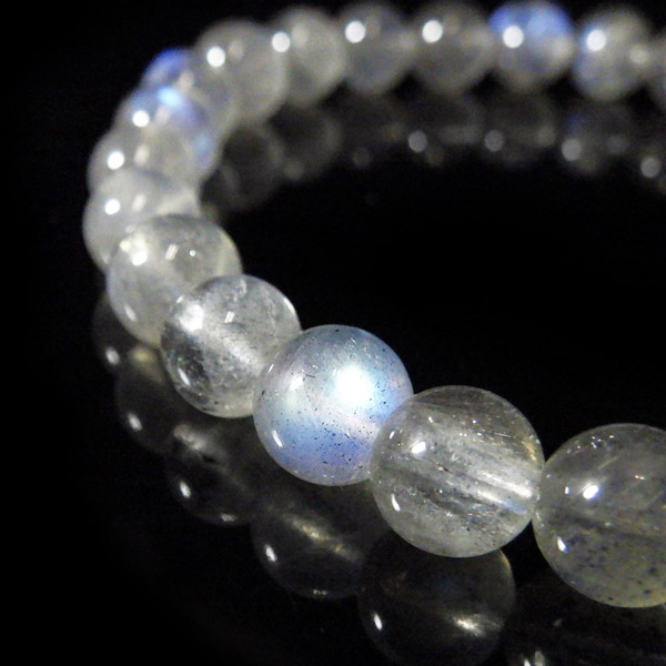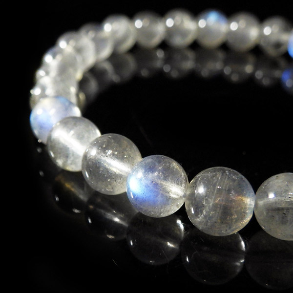 マダガスカル産、ラブラドライトのブレスレットです。 見る角度によってブルーを中心とした色彩を変える光が特徴的です。石自体は透明感のあるグレーの色合いをしていますが、そこに鮮やかな輝きが浮かび上がるところから「アゲハ蝶の羽」に例えられる事もある美しい石です。