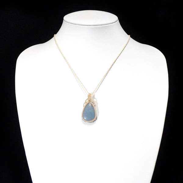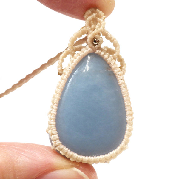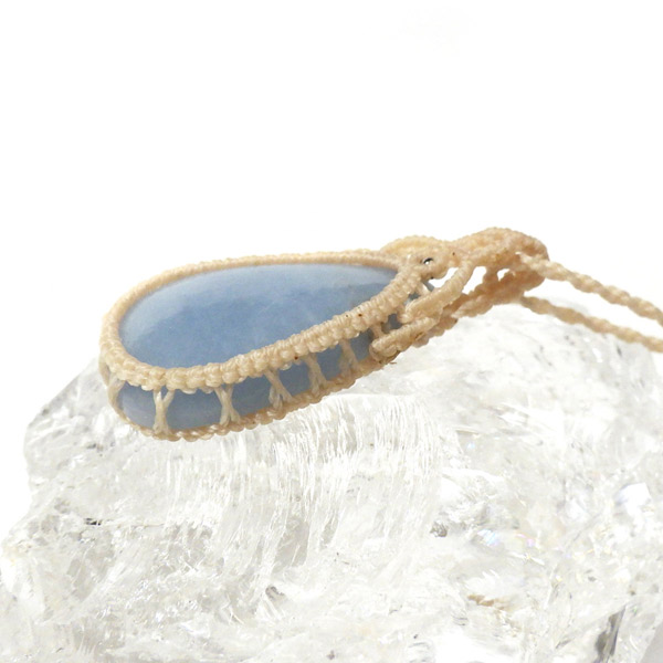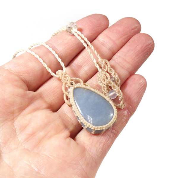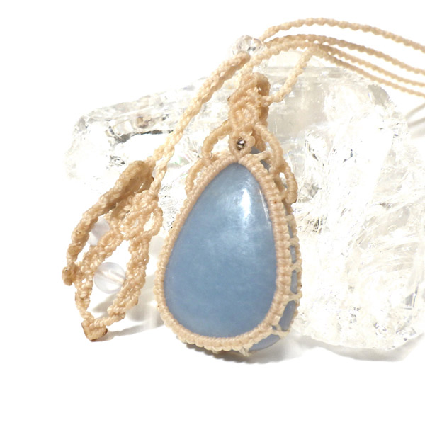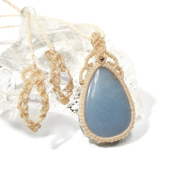 ペルー産のエンジェライトを使用したマクラメペンダントです。 優しい色味のきれいなエンジェライトを使用しました。大切な存在に気付かせてくれる、広く優しい心を持たせてくれるなど、とても素敵な意味合いのエンジェライトをいつも身に着けて頂けるように可愛らしいペンダントに仕上げました。