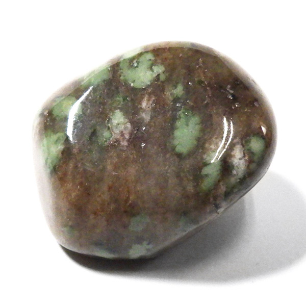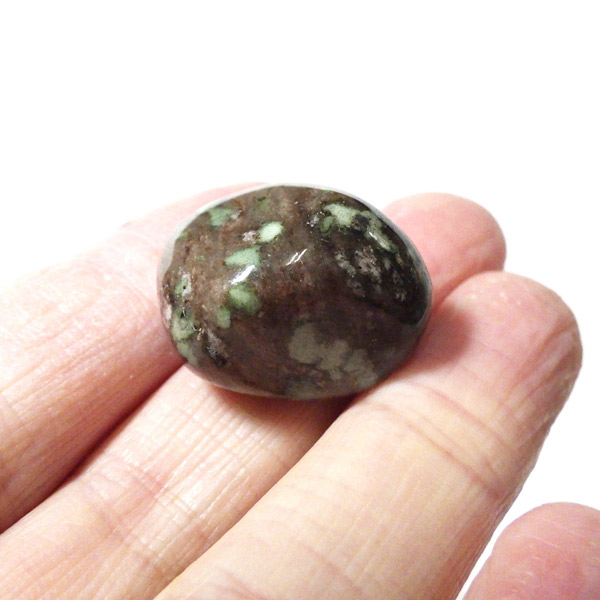オーストラリア産のナンドライト、タンブルです。ナンドライトはオーストラリア・ニューサウスウェールズ州の小さな町ナンドルが産地である、希少であまり知られていない岩石です。ナンドライトという名前は、この産地に由来しています。ナンドライトの本質的な分類はエジリン閃長岩(エジリン・サイアナイト)にあたります。茶色やベージュ系のサイアナイト母岩の中に、深いグリーンのエジリンがドット状に散りばめられており、その独特な模様と色合いが非常に魅力的です。