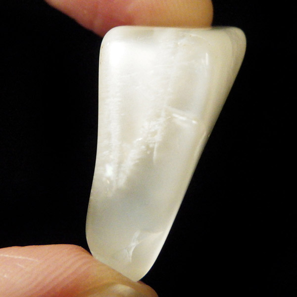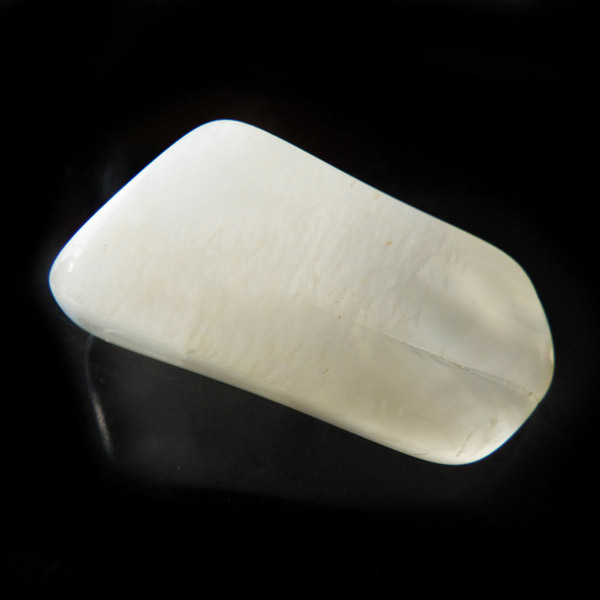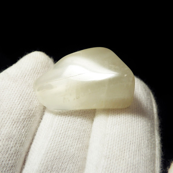 インド産のムーンストーンです。ムーンストーンは長石という鉱物グループの一種で、和名を月長石といいます。石の内部にある層が光を乱反射して出現する真珠のような柔らかい光の効果を「シラー効果」と呼び、ムーンストーンに見られる特徴です。こちらの石自体は黄色味を帯びた白といった色味で、主に白系の綺麗なシラーが見られます。