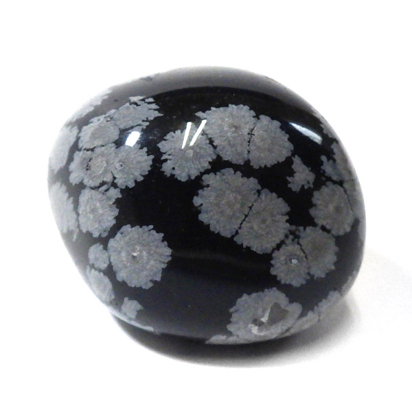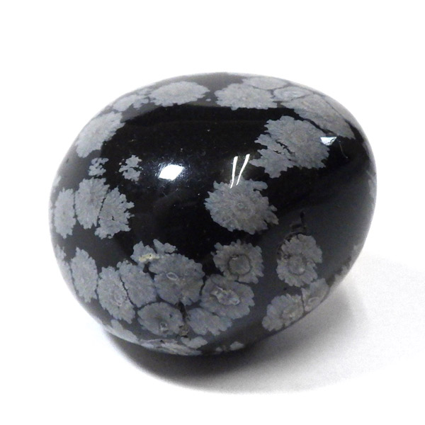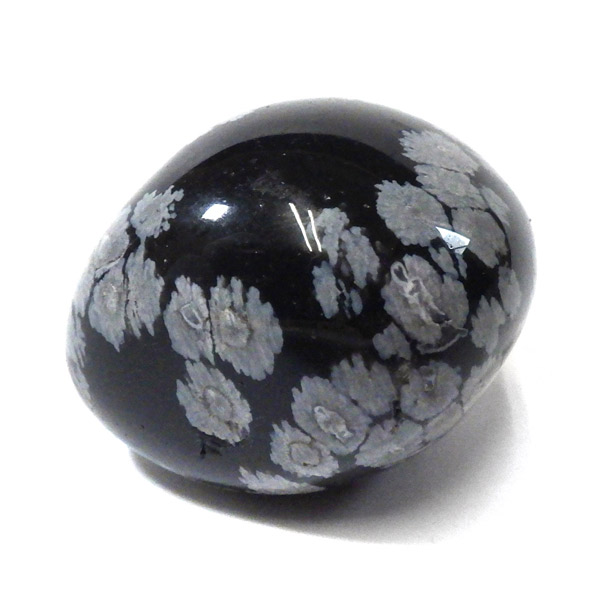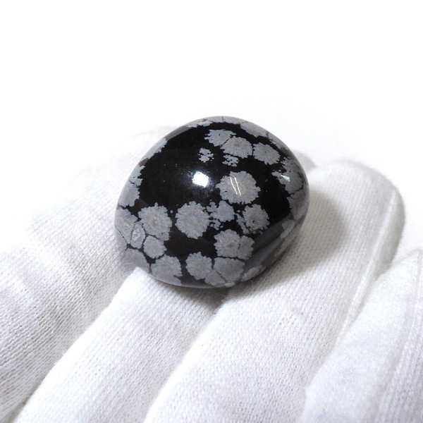 メキシコ産のスノーフレークオブシディアン、タンブルです。オブシディアンは、火山性の天然ガラスです。その中にクリストバライトという火山性鉱物が入り込んで、白い斑点模様を織り成しているのです。表面に雪の結晶のような模様が見えるのが特徴です。