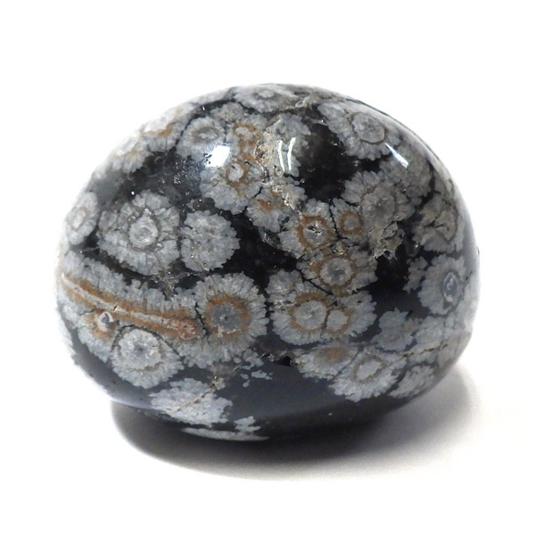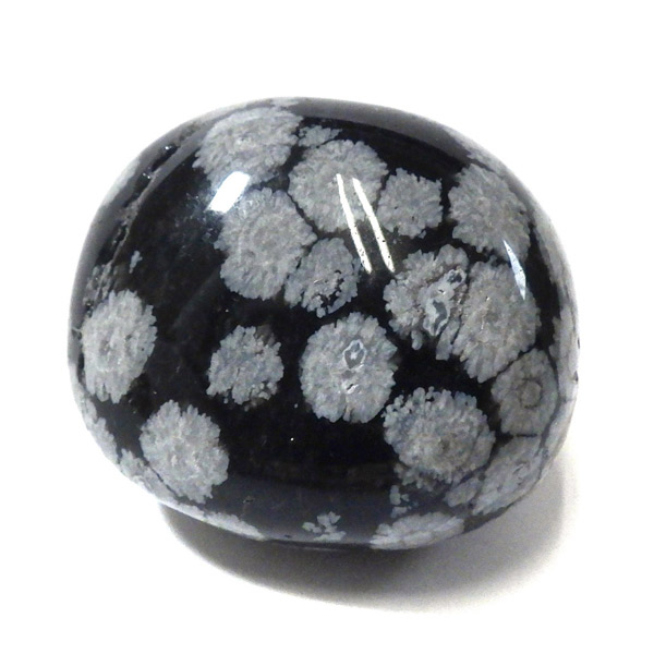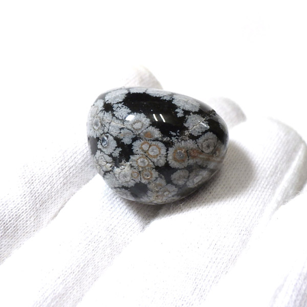メキシコ産のスノーフレークオブシディアン、タンブルです。オブシディアンは、火山性の天然ガラスです。その中にクリストバライトという火山性鉱物が入り込んで、白い斑点模様を織り成しているのです。表面に雪の結晶のような模様が見えるのが特徴です。