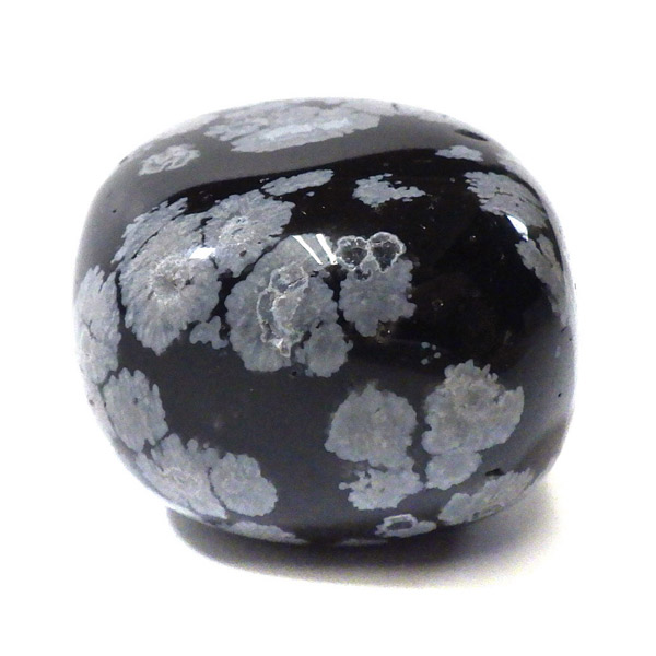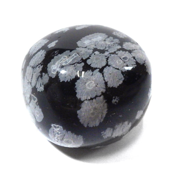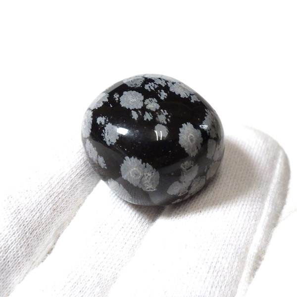 メキシコ産のスノーフレークオブシディアン、タンブルです。オブシディアンは、火山性の天然ガラスです。その中にクリストバライトという火山性鉱物が入り込んで、白い斑点模様を織り成しているのです。表面に雪の結晶のような模様が見えるのが特徴です。
