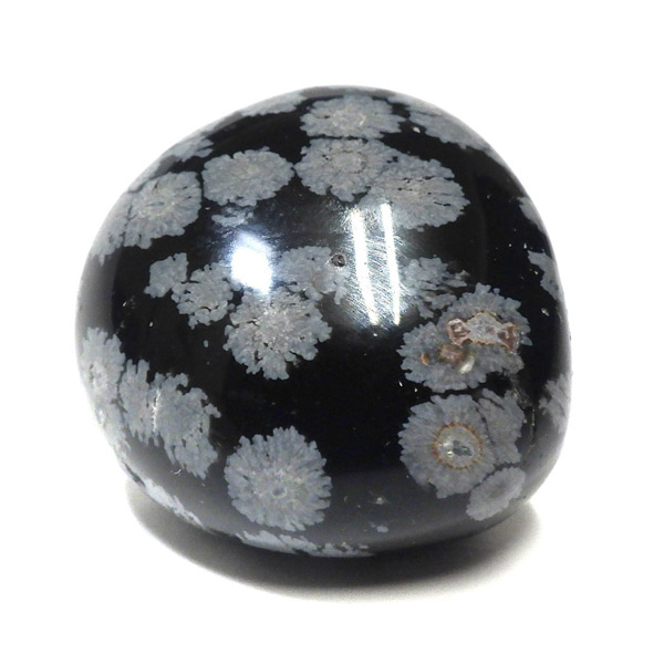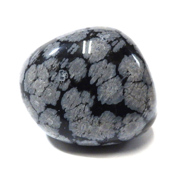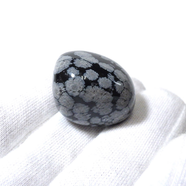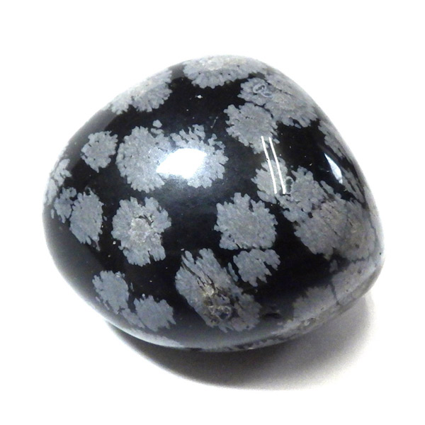 メキシコ産のスノーフレークオブシディアン、タンブルです。オブシディアンは、火山性の天然ガラスです。その中にクリストバライトという火山性鉱物が入り込んで、白い斑点模様を織り成しているのです。表面に雪の結晶のような模様が見えるのが特徴です。