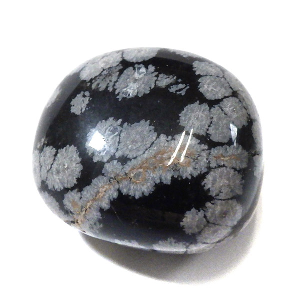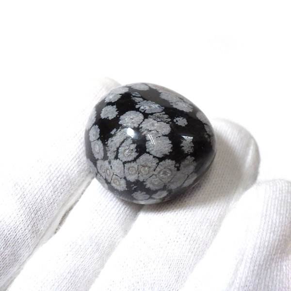 メキシコ産のスノーフレークオブシディアン、タンブルです。オブシディアンは、火山性の天然ガラスです。その中にクリストバライトという火山性鉱物が入り込んで、白い斑点模様を織り成しているのです。表面に雪の結晶のような模様が見えるのが特徴です。
