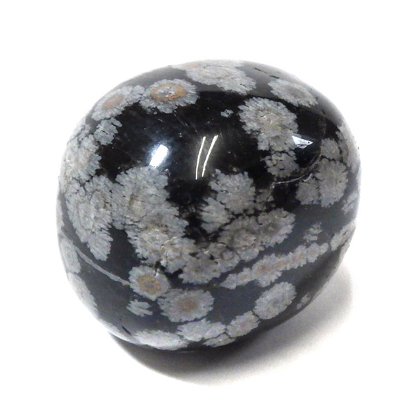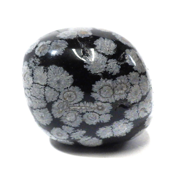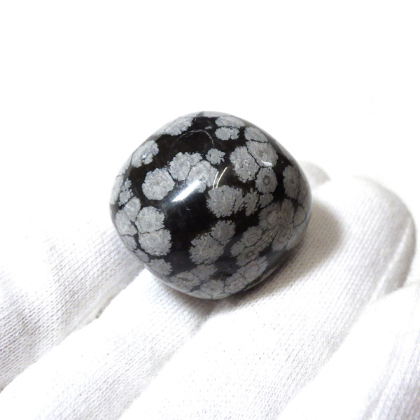 メキシコ産のスノーフレークオブシディアン、タンブルです。オブシディアンは、火山性の天然ガラスです。その中にクリストバライトという火山性鉱物が入り込んで、白い斑点模様を織り成しているのです。表面に雪の結晶のような模様が見えるのが特徴です。
