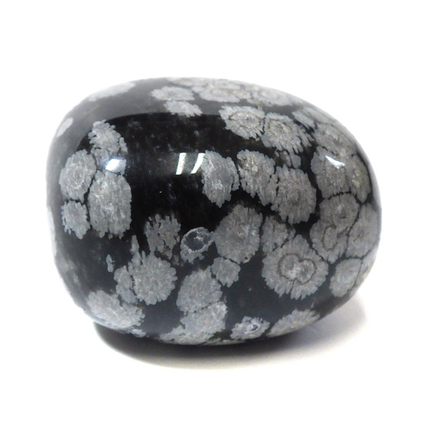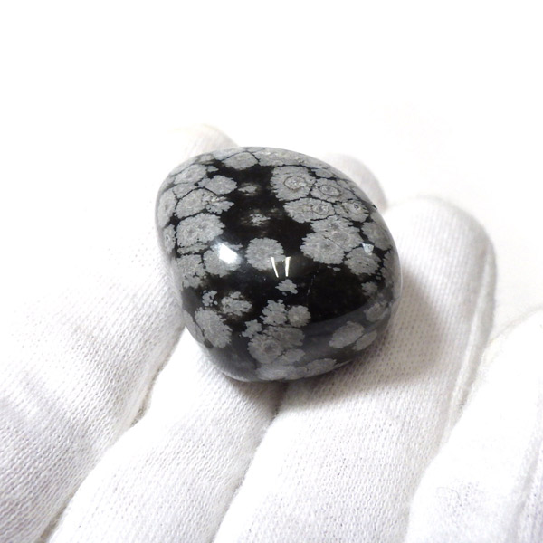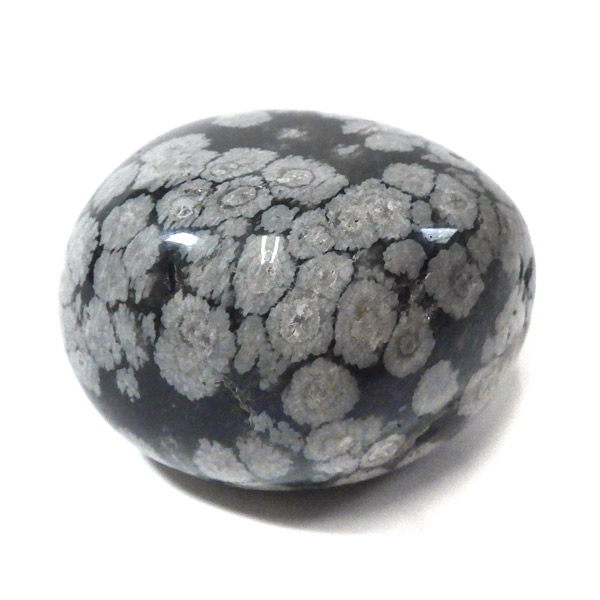 メキシコ産のスノーフレークオブシディアン、タンブルです。オブシディアンは、火山性の天然ガラスです。その中にクリストバライトという火山性鉱物が入り込んで、白い斑点模様を織り成しているのです。表面に雪の結晶のような模様が見えるのが特徴です。