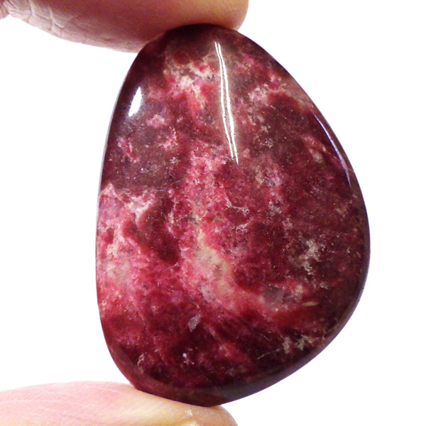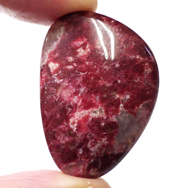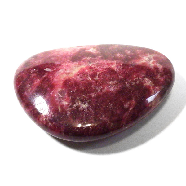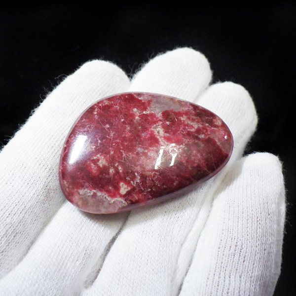 ノルウェー産チューライト、磨きペブルです。赤みの発色の良い高品質なチューライトです。深紅といった色合いがぴったりでしょうか。手のひらで包めるような大きさで平たく磨いております。チューライトは、ノルウェーなど、限られた地域のみで産出される、希少な石です。タンザナイト等も含まれるゾイサイトグループのバリエーションの一つで、その中でもピンク~赤色をしているものをさします。緑色をしているものは「アニョライト」、青色をしているものは「タンダナイト」と分類されます。その赤色の発色は、含まれる鉄とマンガンに起因しています。