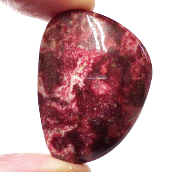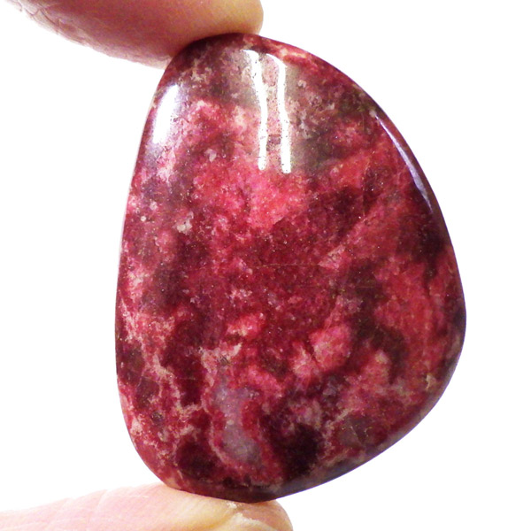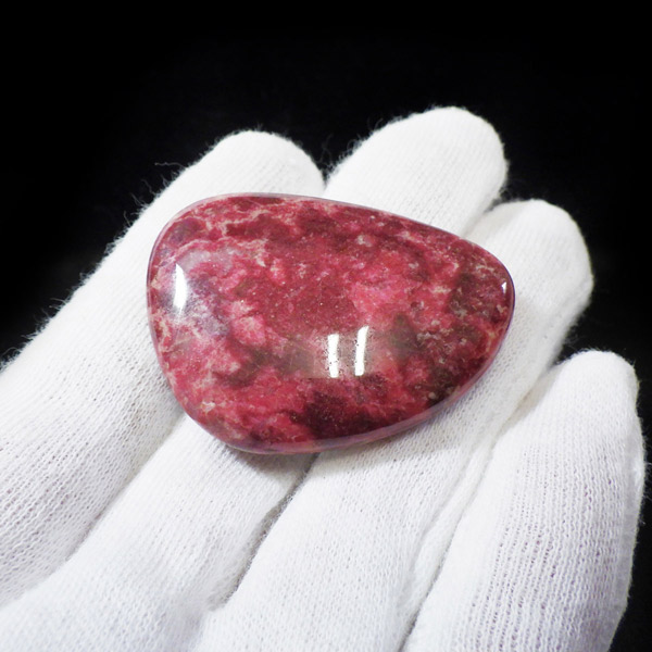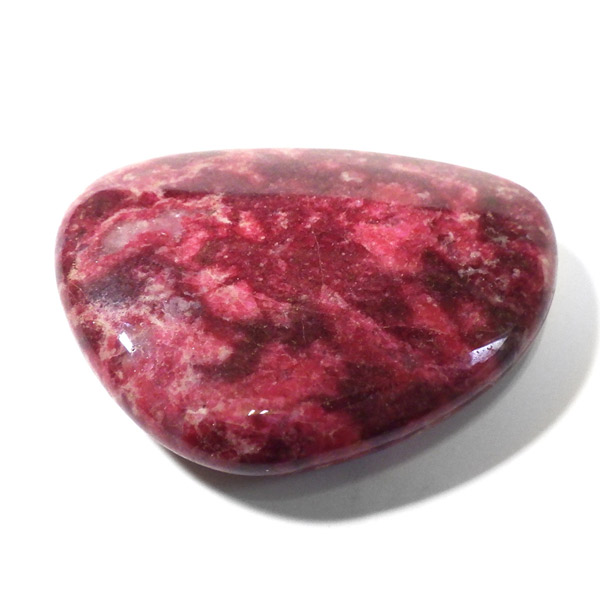 ノルウェー産チューライト、磨きペブルです。赤みの発色の良い高品質なチューライトです。深紅といった色合いがぴったりでしょうか。手のひらで包めるような大きさで平たく磨いております。チューライトは、ノルウェーなど、限られた地域のみで産出される、希少な石です。タンザナイト等も含まれるゾイサイトグループのバリエーションの一つで、その中でもピンク~赤色をしているものをさします。緑色をしているものは「アニョライト」、青色をしているものは「タンダナイト」と分類されます。その赤色の発色は、含まれる鉄とマンガンに起因しています。