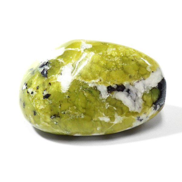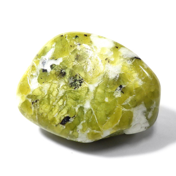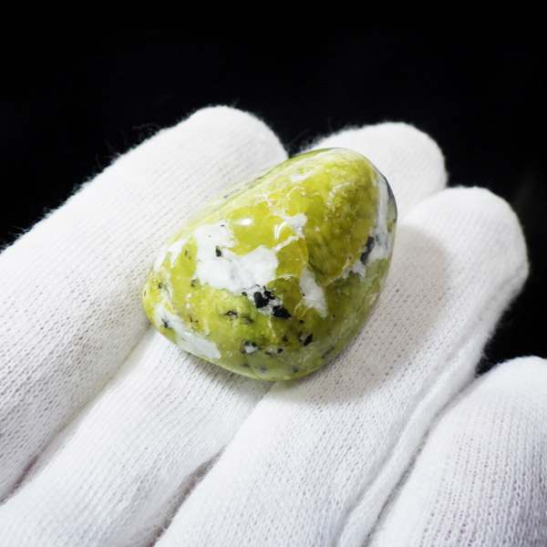 ノルウェー産のリザーダイト、タンブルです。リザーダイトは、サーペンティンの一種です。日本では黄色であるところから「きなこ石」と呼ばれていたりもする、非常に微細な板状の塊が特徴の鉱物です。