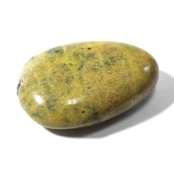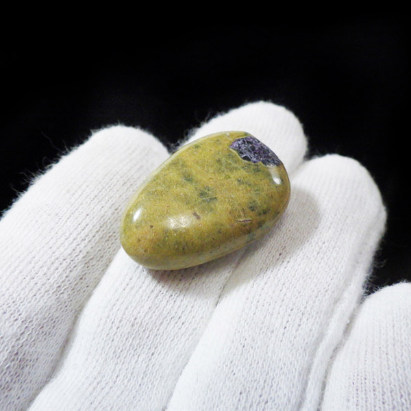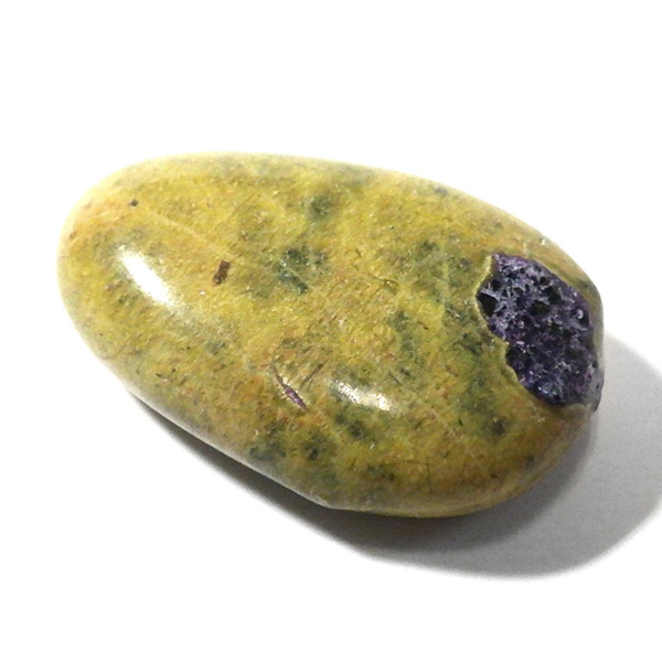 オーストラリア産のアトランティサイト、タンブルです。 鮮やかな黄緑のサーペンティン(リザーダイト)に、またまた鮮やかな紫色のスティヒタイトが点々と彩りを添え、色彩のハーモニーが美しく印象的です。
