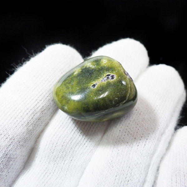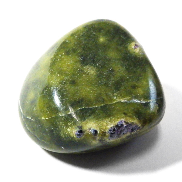 オーストラリア産のアトランティサイト、タンブルです。 鮮やかな黄緑のサーペンティン(リザーダイト)に、またまた鮮やかな紫色のスティヒタイトが点々と彩りを添え、色彩のハーモニーが美しく印象的です。