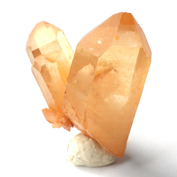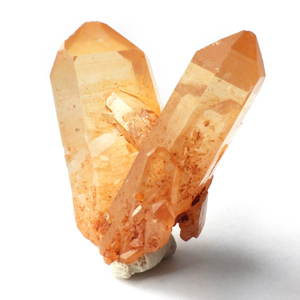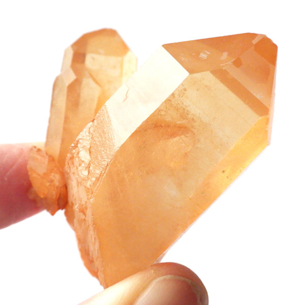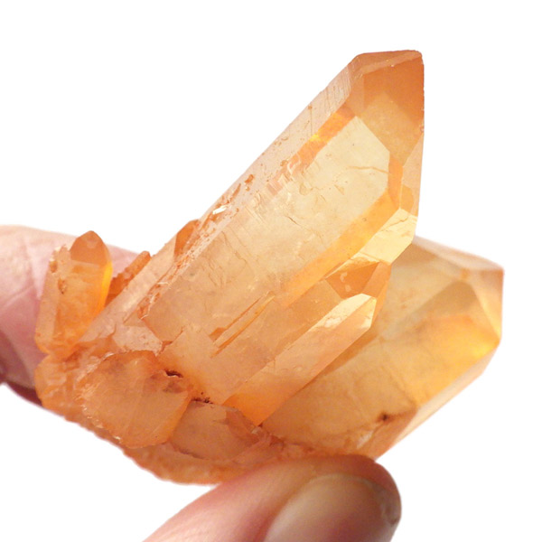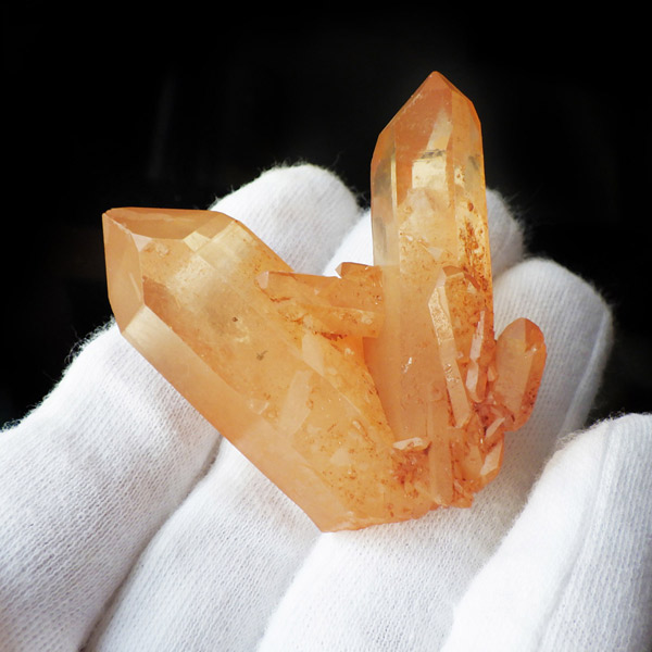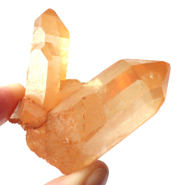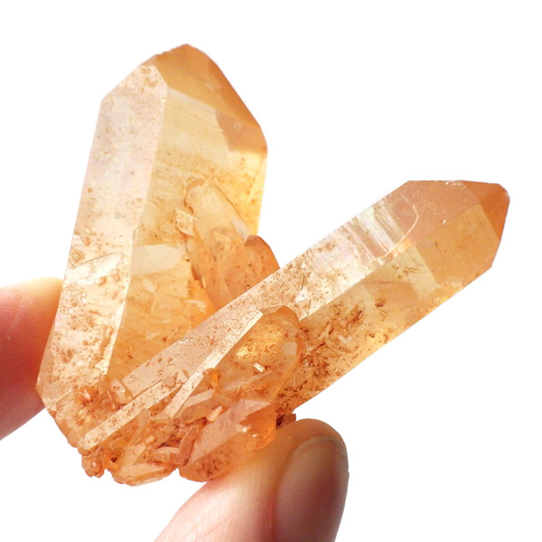 ブラジル産のゴールデンヒーラータンジェリンクォーツ、クラスターです。タンジェリンクォーツとはオレンジ色に色づいた美しい水晶です。このオレンジ色は水晶の表面に鉄成分等が付着し、それが酸化してできます。ゴールデンヒーラーはその中でも結晶表面が光の反射でオーラを纏ったようなレインボーに輝く数少ない水晶のことです。透明度もあり、形も良く、非常に美しい水晶です。