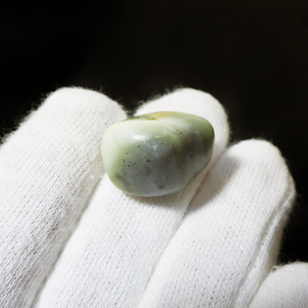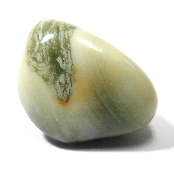 インド産のインフィナイト、タンブルです。インフィナイトはケイ酸マグネシウム鉱物で、クリソタイルとサーペンティンの組み合わせといわれています。通常、黄色、クリーム、緑、などの優しい色味をしており、縞模様が特徴的です。サーペンティンの一種で南アフリカで見つかるものを特別視し、インフィナイトと名づけられました。現在、インフィナイトは南アフリカとインドでしか見られない組み合わせとのことです。インフィナイトストーン、インフィナイトサーペンティンとも呼ばれています。