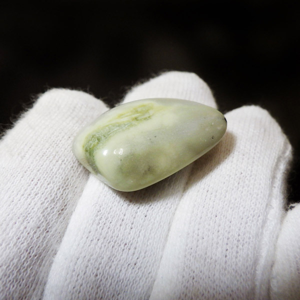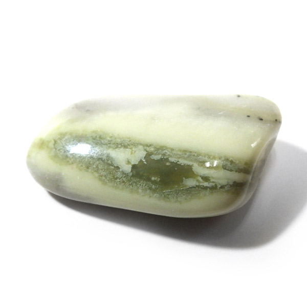 インド産のインフィナイト、タンブルです。インフィナイトはケイ酸マグネシウム鉱物で、クリソタイルとサーペンティンの組み合わせといわれています。通常、黄色、クリーム、緑、などの優しい色味をしており、縞模様が特徴的です。サーペンティンの一種で南アフリカで見つかるものを特別視し、インフィナイトと名づけられました。現在、インフィナイトは南アフリカとインドでしか見られない組み合わせとのことです。インフィナイトストーン、インフィナイトサーペンティンとも呼ばれています。