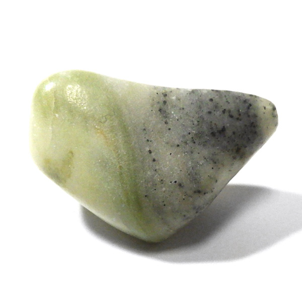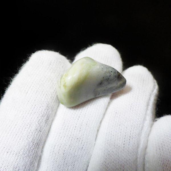 インド産のインフィナイト、タンブルです。インフィナイトはケイ酸マグネシウム鉱物で、クリソタイルとサーペンティンの組み合わせといわれています。通常、黄色、クリーム、緑、などの優しい色味をしており、縞模様が特徴的です。サーペンティンの一種で南アフリカで見つかるものを特別視し、インフィナイトと名づけられました。現在、インフィナイトは南アフリカとインドでしか見られない組み合わせとのことです。インフィナイトストーン、インフィナイトサーペンティンとも呼ばれています。
