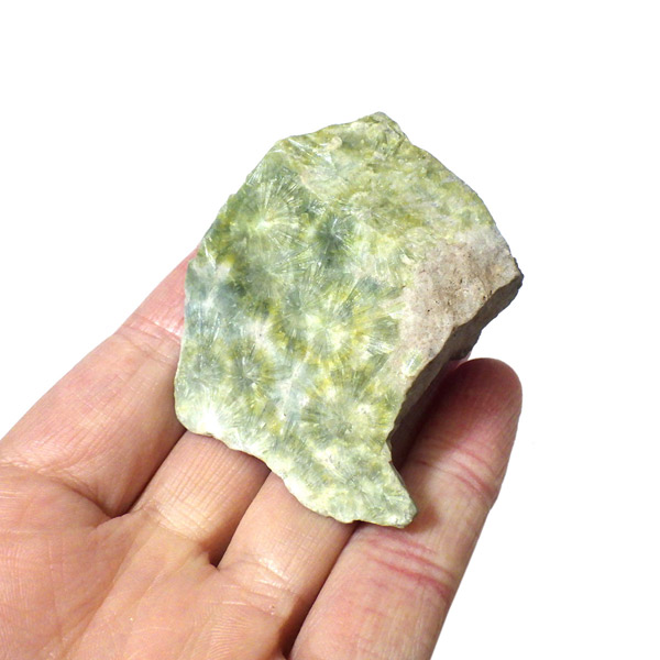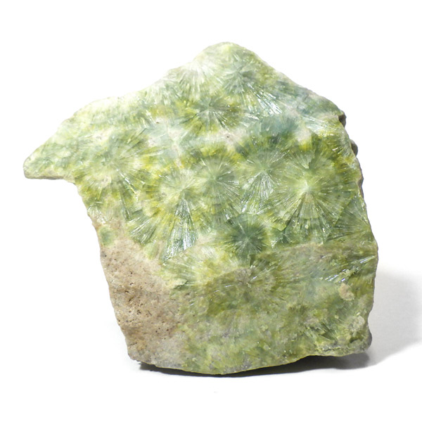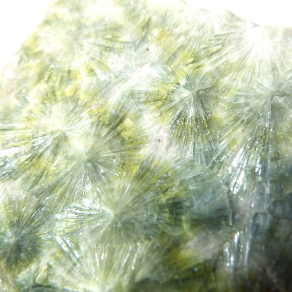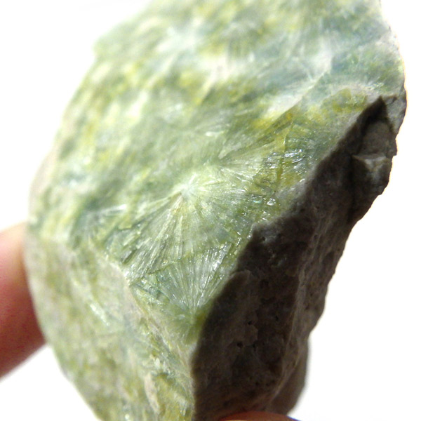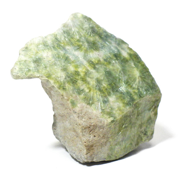 アメリカ・アーカンソー州産のワーべライト原石です。 美しい放射状の結晶形が確認でき、角度を変えて輝く結晶の光沢が美しいです。和名は銀星石、アルミニウムの含水燐酸塩鉱物です。グリーンの発色が良い、大変綺麗な原石になります。
