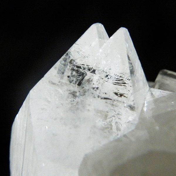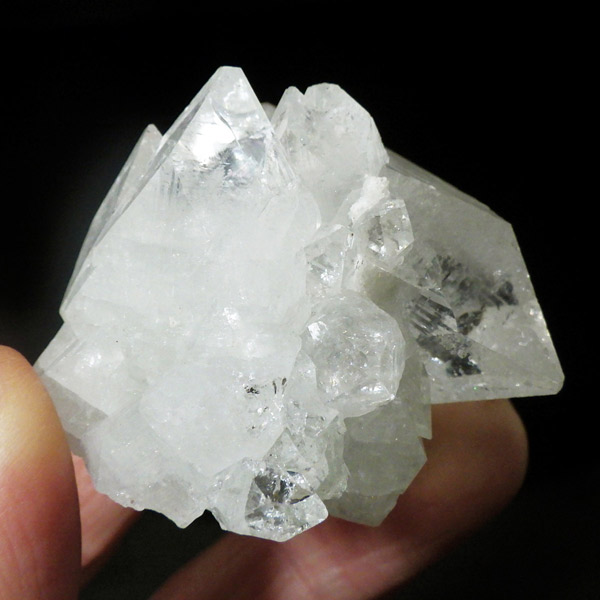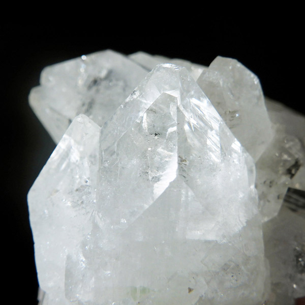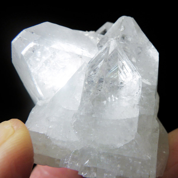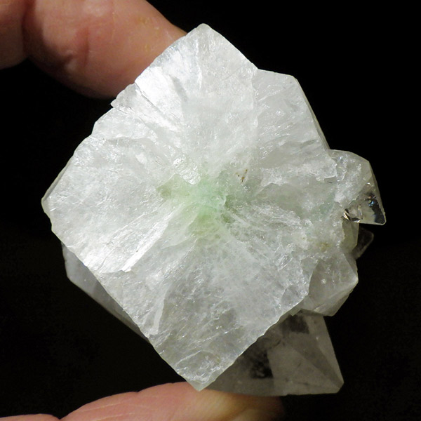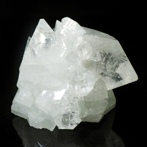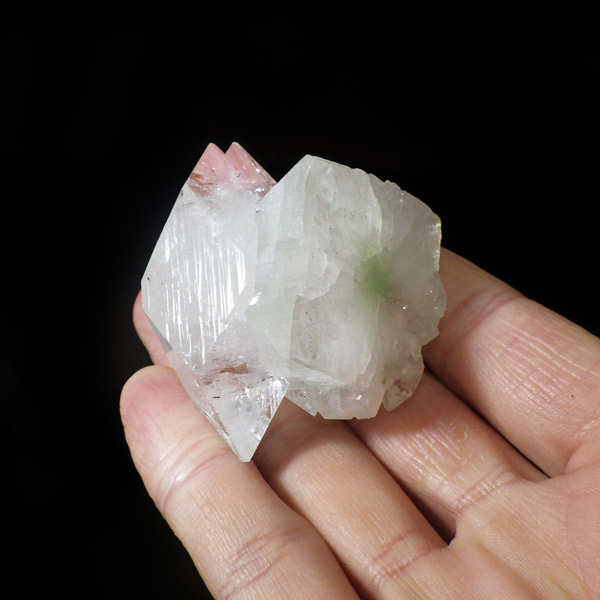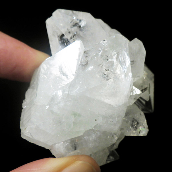 インド産のアポフィライト原石です。非常に素晴らしい透明度で、ガラス質のブロック状のアポフィライト結晶を中心に、完全に無垢で損傷のない見事な標本です。カラーはクリア、中心にグリーンの部分があります。結晶表面の条線も美しく、くっきり表れており、レインボーも見られます。複数の結晶からなったクラスターでバランスのとれた見事なアポフィライトです。