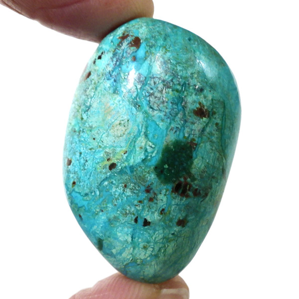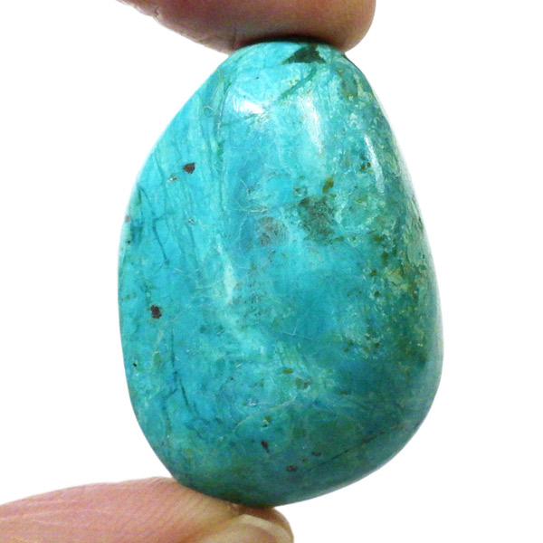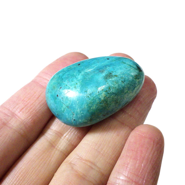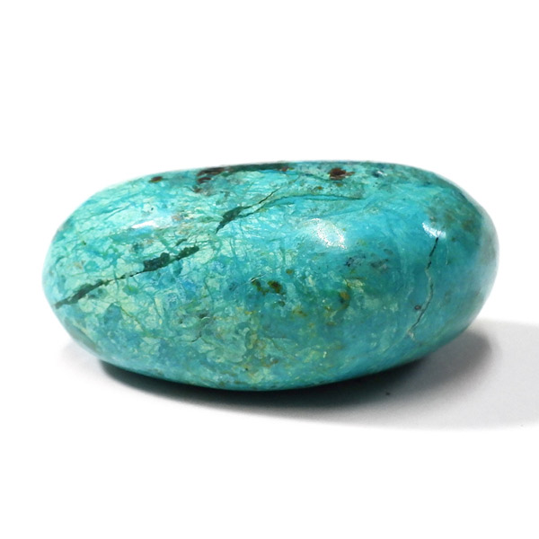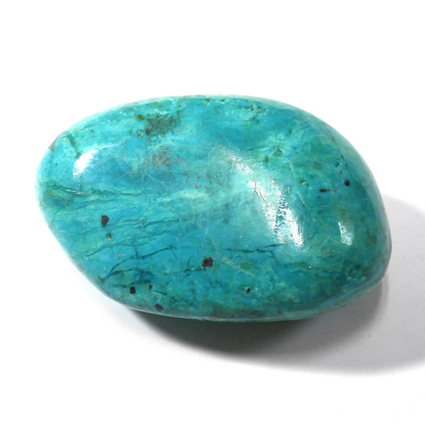 ペルー産のシャッタカイトクリソコラのタンブルです。シャッタカイトは銅のケイ酸塩の水酸化物の鉱物で、1915年に最初に発見されたアメリカのアリゾナ州のシャッタク鉱山が名前の由来です。そこではマラカイトも産出されましたが、マラカイトの結晶を保ったまま成分が入れ替わる、仮晶という現象が起き、それがシャッタカイトとして発見されました。シャッタカイトは奥深い緑みの青から鮮やかな緑みの青が特徴の鉱物です。主に銅鉱床の酸化帯でクリソコラ、マラカイト、キュープライトなども含まれます。
