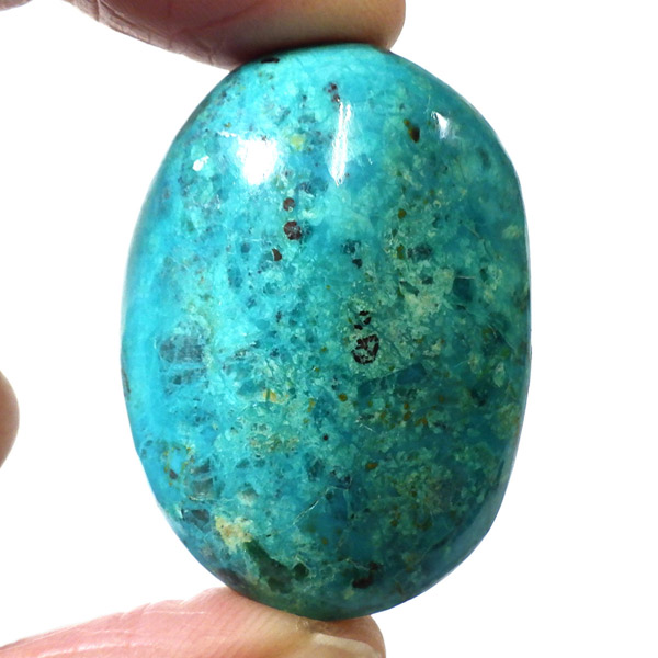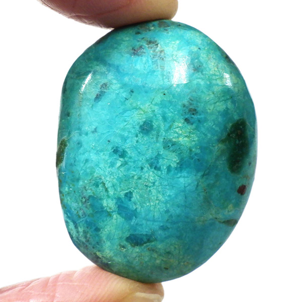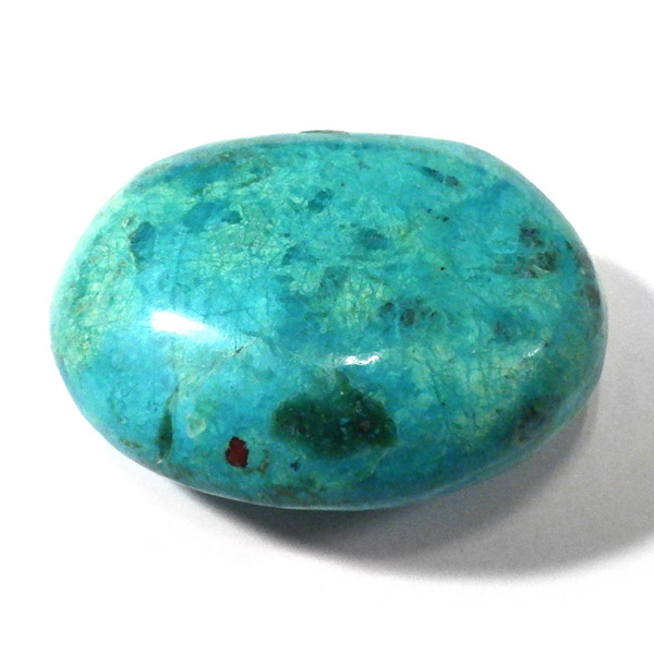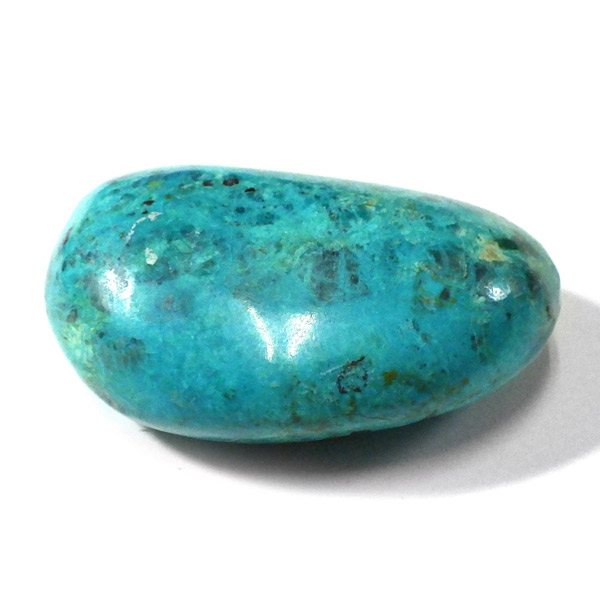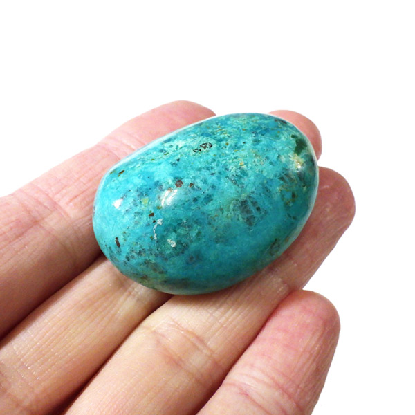 ペルー産のシャッタカイトクリソコラのタンブルです。シャッタカイトは銅のケイ酸塩の水酸化物の鉱物で、1915年に最初に発見されたアメリカのアリゾナ州のシャッタク鉱山が名前の由来です。そこではマラカイトも産出されましたが、マラカイトの結晶を保ったまま成分が入れ替わる、仮晶という現象が起き、それがシャッタカイトとして発見されました。シャッタカイトは奥深い緑みの青から鮮やかな緑みの青が特徴の鉱物です。主に銅鉱床の酸化帯でクリソコラ、マラカイト、キュープライトなども含まれます。
