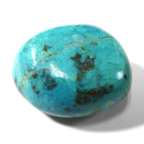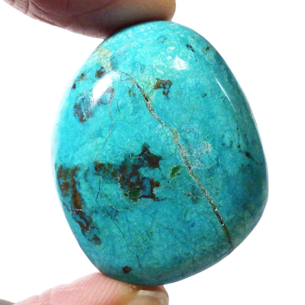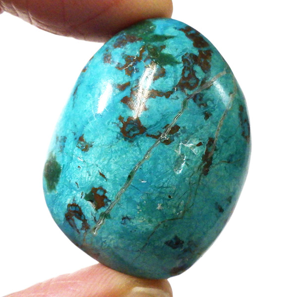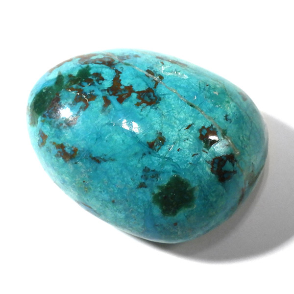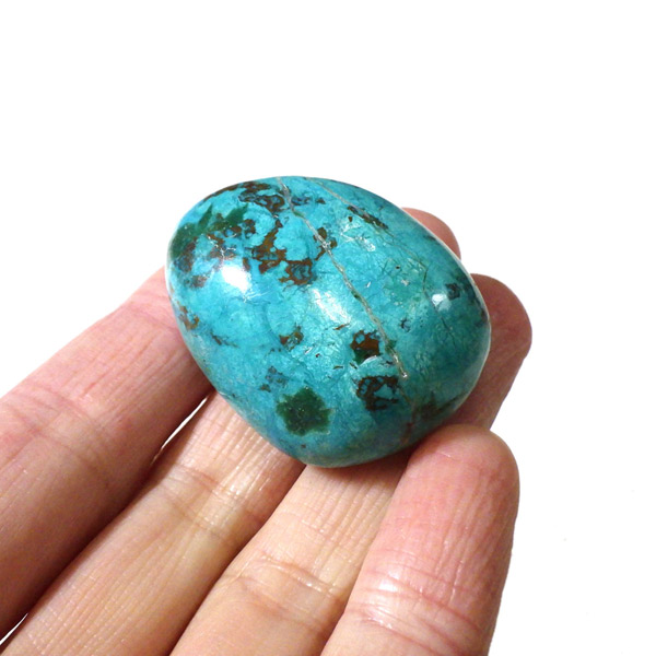 ペルー産のシャッタカイトクリソコラのタンブルです。シャッタカイトは銅のケイ酸塩の水酸化物の鉱物で、1915年に最初に発見されたアメリカのアリゾナ州のシャッタク鉱山が名前の由来です。そこではマラカイトも産出されましたが、マラカイトの結晶を保ったまま成分が入れ替わる、仮晶という現象が起き、それがシャッタカイトとして発見されました。シャッタカイトは奥深い緑みの青から鮮やかな緑みの青が特徴の鉱物です。主に銅鉱床の酸化帯でクリソコラ、マラカイト、キュープライトなども含まれます。