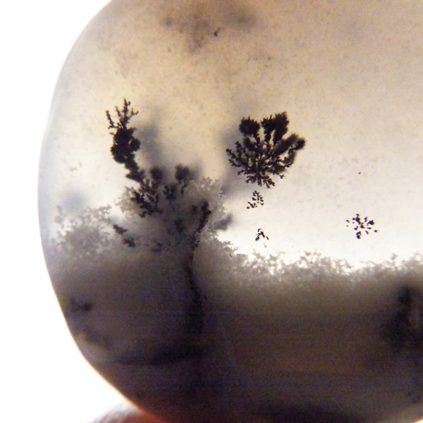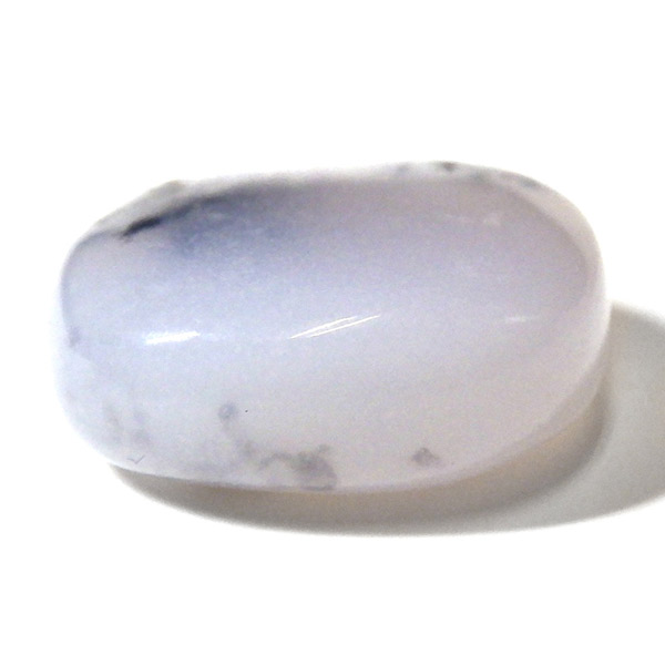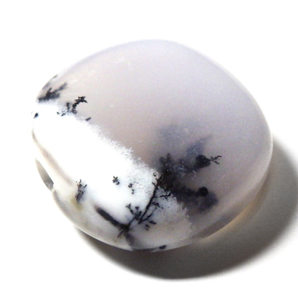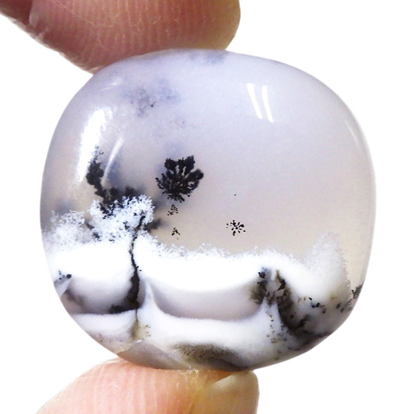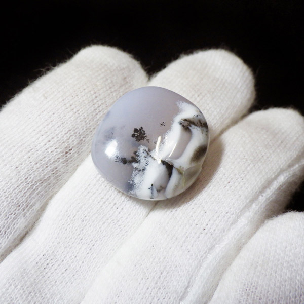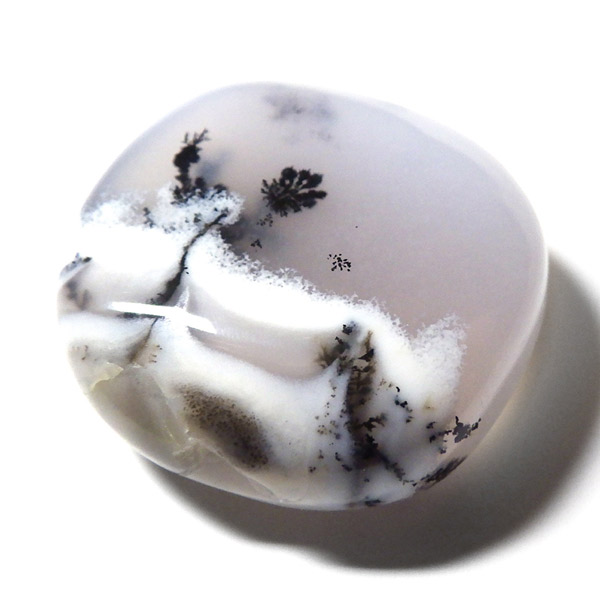トルコ産のデンドリティックアゲート、タンブルです。デンドリティックアゲートはアゲートまたはクォーツ、オパール内に樹枝状のインクルージョンが見られるもののことです。主に白と黒の混ざった模様が特徴的でまとめてデンドライトとも呼ばれます。酸化マンガンや酸化鉄が割れ目に侵入して模様ができたとされています。模様を付けたように見えますが、これが自然に生成されているので神秘的です。伝説的な魔法使いマーリンにちなんで「メルリナイト/マーリナイト」という名前でも呼ばれています。