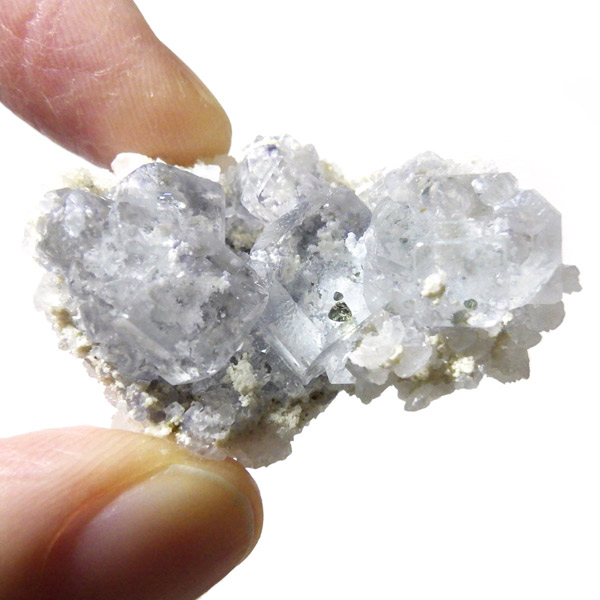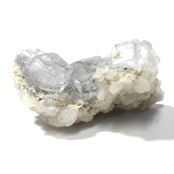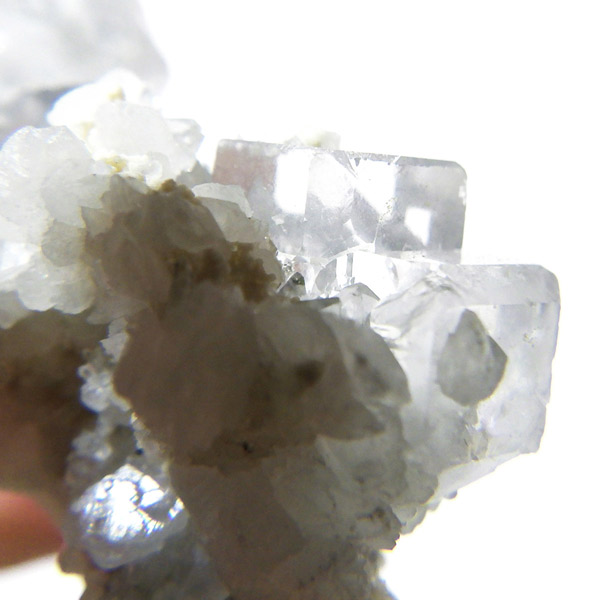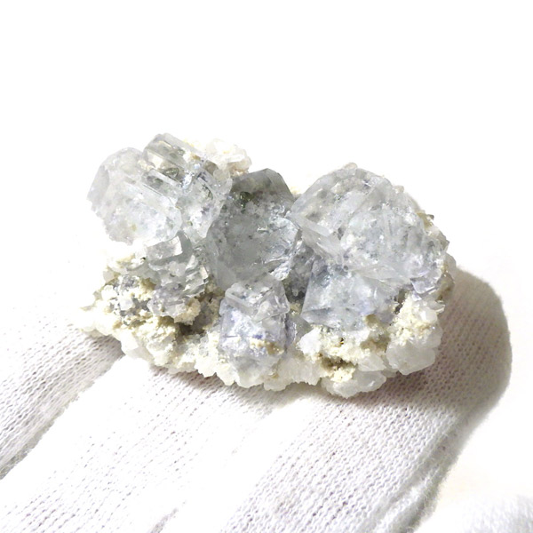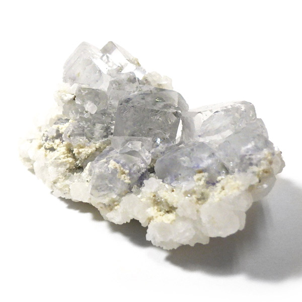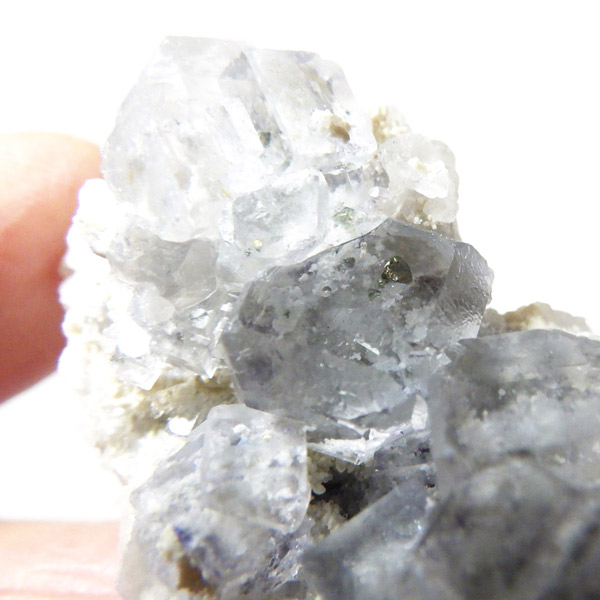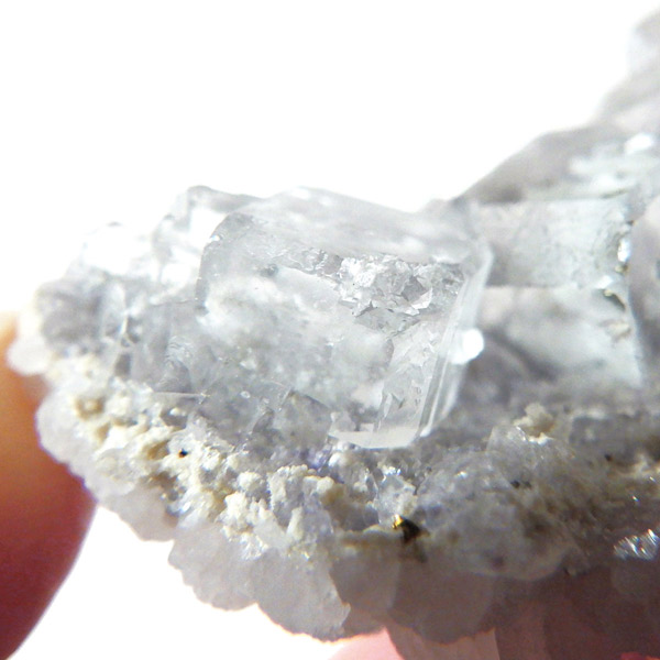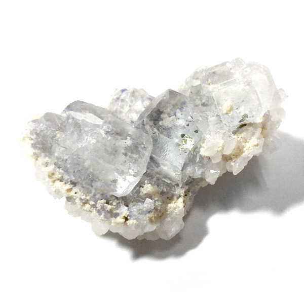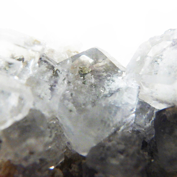 ロシア・ダルネゴルスク産のカラーレスフローライト原石です。フローライトにはさまざまな色合いがありますが、ダルネゴルスク産のフローライトは、不純物がなく、純粋なフローライトなので、無色透明で大変クリアーなことが特徴です。また、特徴的な結晶形を持ち、内部には大変綺麗なレインボーが見られます。水晶やカルサイト、パイライトなどの小さな結晶と共生しています。クリアな面からは、内側のインクルージョンや母岩のかけらが綺麗に確認できます。非常にきれいな結晶形を持ったカラーレスフローライトの標本でおすすめです。