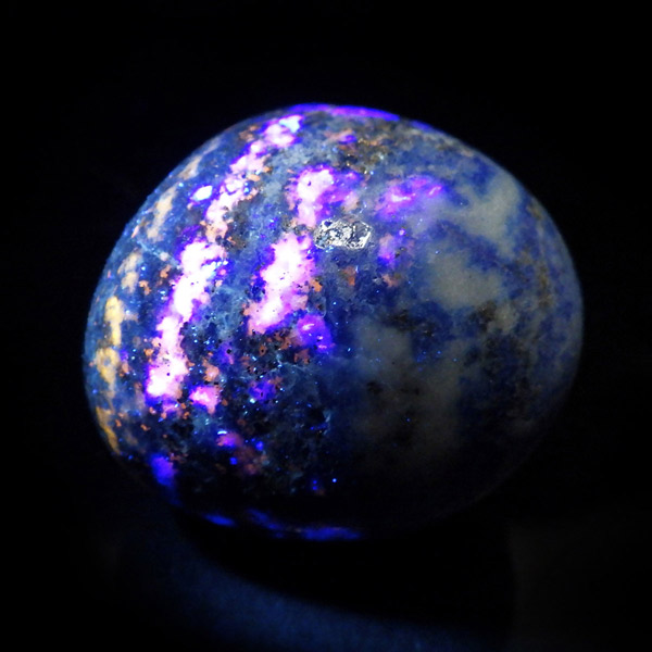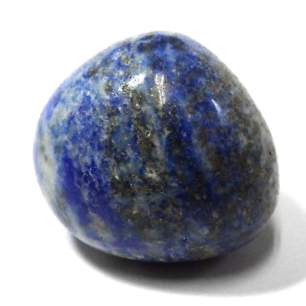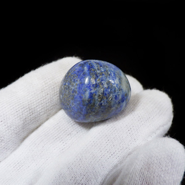アフガニスタン産のラピスラズリ、タンブルです。 ラピスラズリは、ラズライト・アウィン・ソーダライト・ノーゼライトが集合したものです。特に、ラズライトとノーゼライトを多く含有すると、深く美しい色彩のラピスラズリとなります。全体的に、均一な色彩のものは少なく、黄金色の「パイライト」、白色の「カルサイト」など"が小さな斑点としてみられます。一部365nmのブラックライトで蛍光を示します。