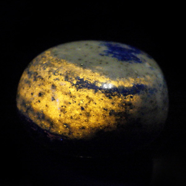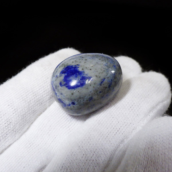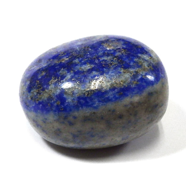 アフガニスタン産のラピスラズリ、タンブルです。 ラピスラズリは、ラズライト・アウィン・ソーダライト・ノーゼライトが集合したものです。特に、ラズライトとノーゼライトを多く含有すると、深く美しい色彩のラピスラズリとなります。全体的に、均一な色彩のものは少なく、黄金色の「パイライト」、白色の「カルサイト」など"が小さな斑点としてみられます。一部365nmのブラックライトで蛍光を示します。