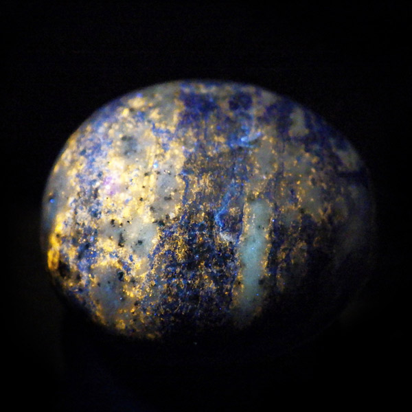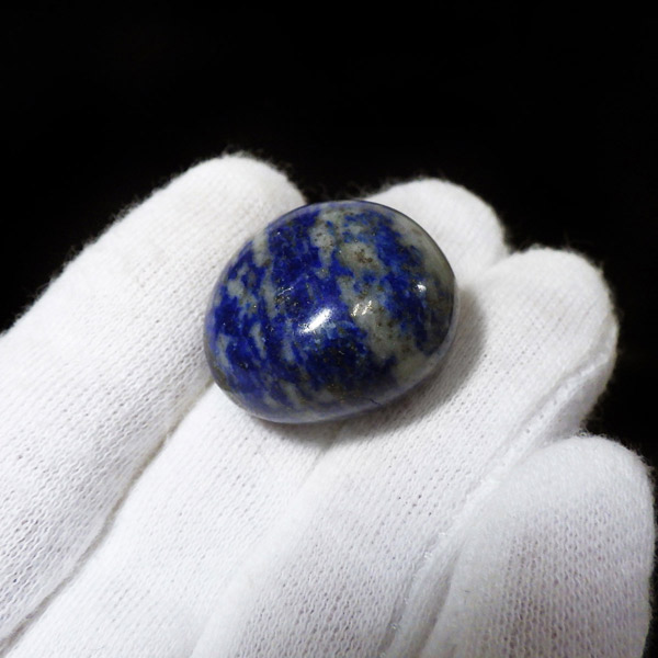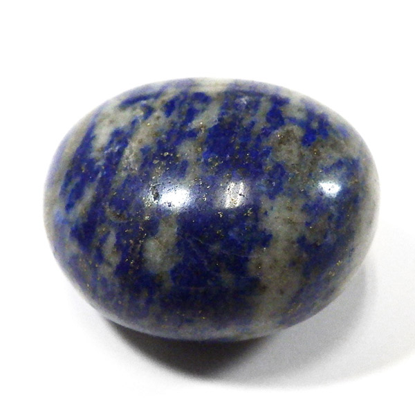 アフガニスタン産のラピスラズリ、タンブルです。 ラピスラズリは、ラズライト・アウィン・ソーダライト・ノーゼライトが集合したものです。特に、ラズライトとノーゼライトを多く含有すると、深く美しい色彩のラピスラズリとなります。全体的に、均一な色彩のものは少なく、黄金色の「パイライト」、白色の「カルサイト」など"が小さな斑点としてみられます。一部365nmのブラックライトで蛍光を示します。