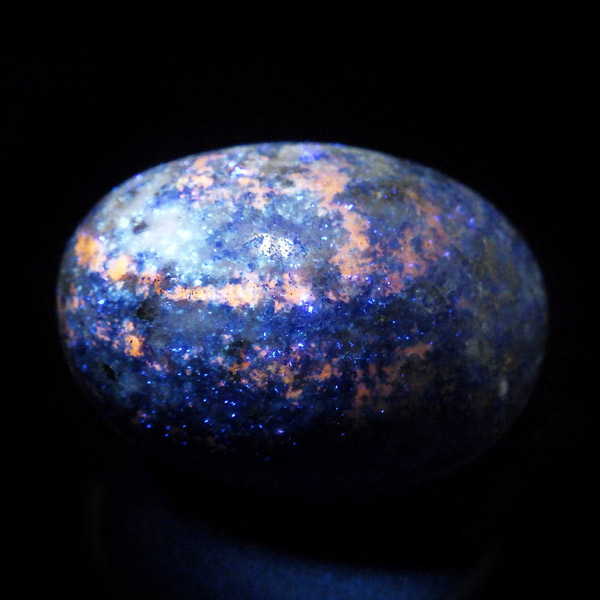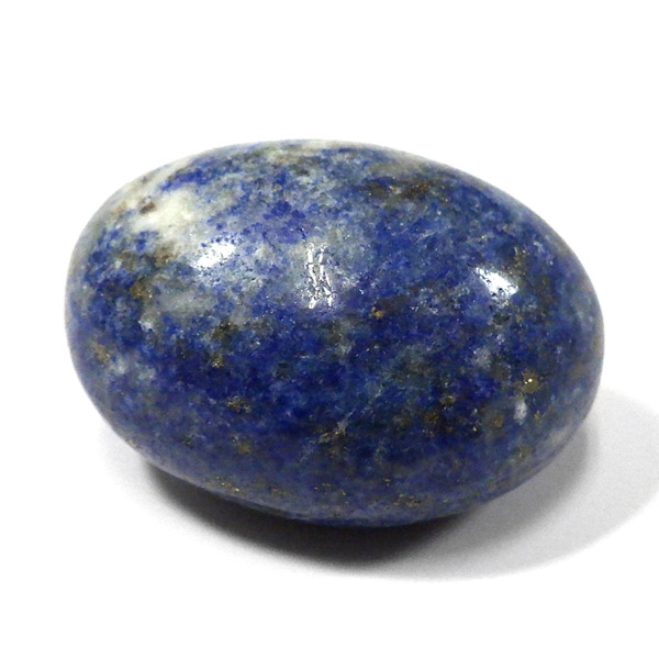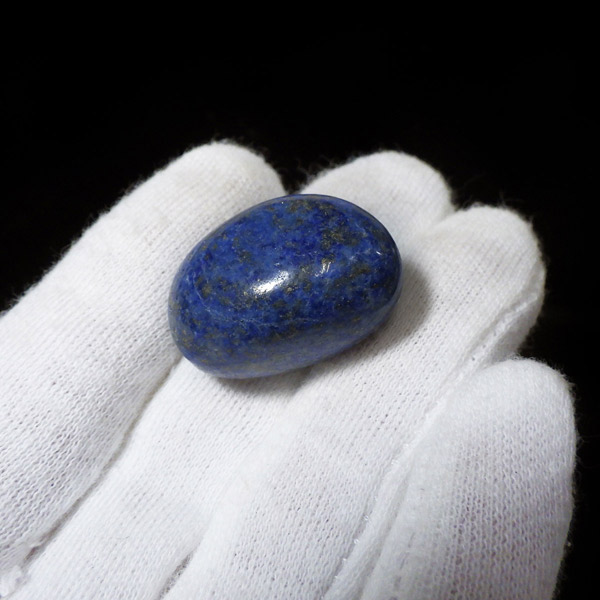 アフガニスタン産のラピスラズリ、タンブルです。 ラピスラズリは、ラズライト・アウィン・ソーダライト・ノーゼライトが集合したものです。特に、ラズライトとノーゼライトを多く含有すると、深く美しい色彩のラピスラズリとなります。全体的に、均一な色彩のものは少なく、黄金色の「パイライト」、白色の「カルサイト」など"が小さな斑点としてみられます。一部365nmのブラックライトで蛍光を示します。