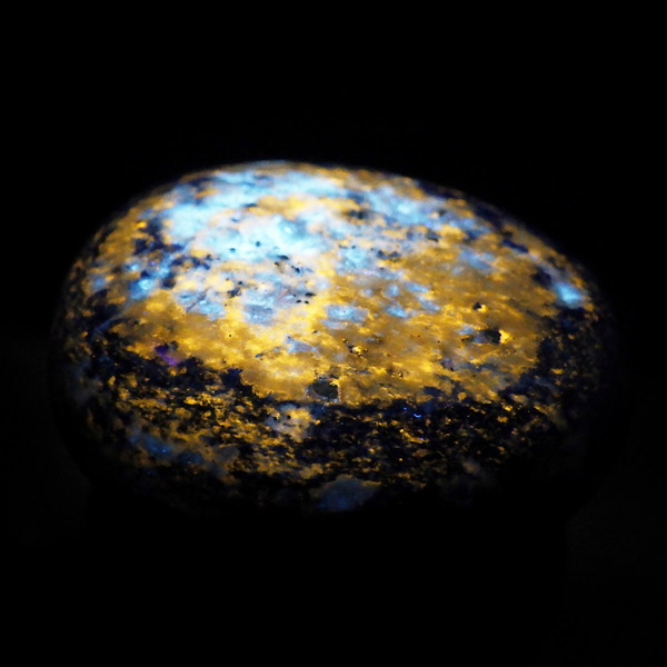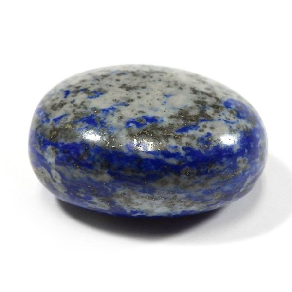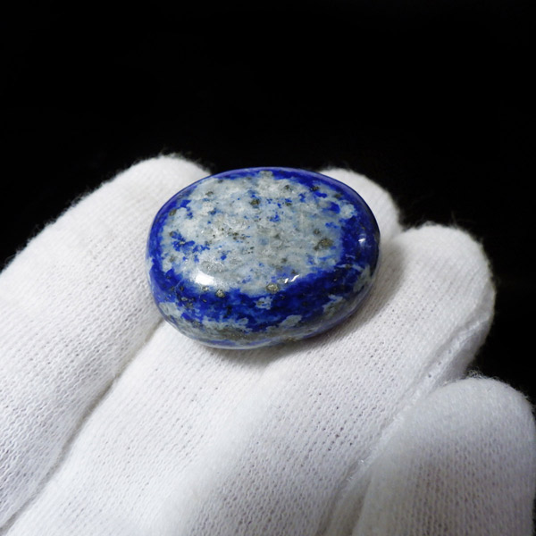 アフガニスタン産のラピスラズリ、タンブルです。 ラピスラズリは、ラズライト・アウィン・ソーダライト・ノーゼライトが集合したものです。特に、ラズライトとノーゼライトを多く含有すると、深く美しい色彩のラピスラズリとなります。全体的に、均一な色彩のものは少なく、黄金色の「パイライト」、白色の「カルサイト」など"が小さな斑点としてみられます。一部365nmのブラックライトで蛍光を示します。