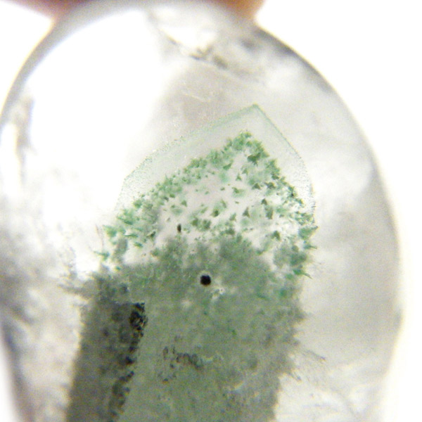 グリーンファントムクォーツは透明感のある水晶の内部に、グリーンのファントム(幻影)が浮かび上がる神秘的な石です。これは水晶が成長する過程で、セラドナイトやフックサイトなどの緑色鉱物が取り込まれ、その後再び水晶が成長することで層状の模様として残ったものです。まるで水晶の中に小さな山や景色が閉じ込められているかのような自然のアートを楽しめます。