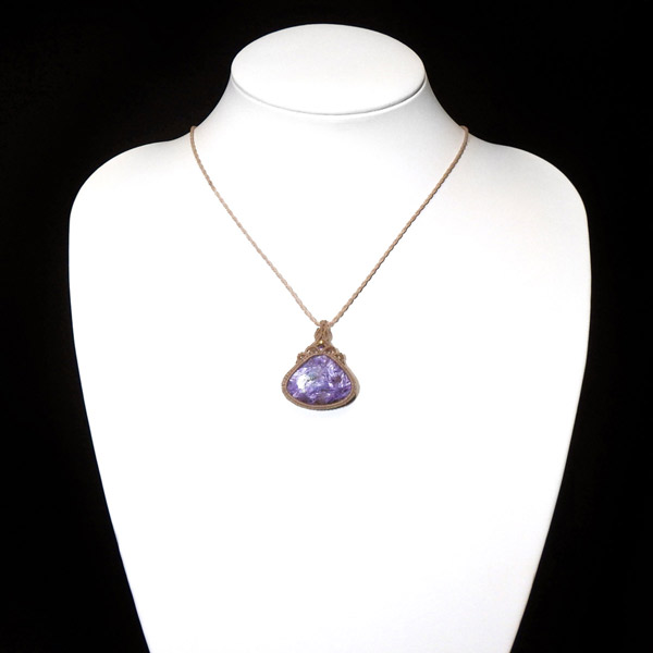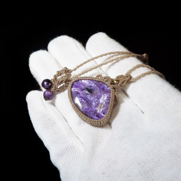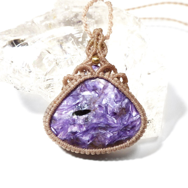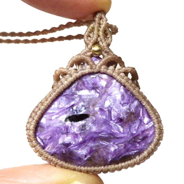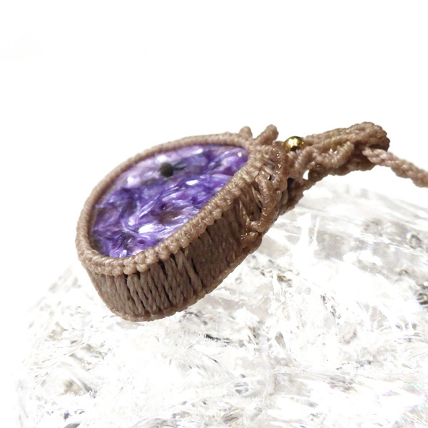 神秘的な紫の模様が美しい、ロシア産のチャロアイトを使ったマクラメペンダントです。