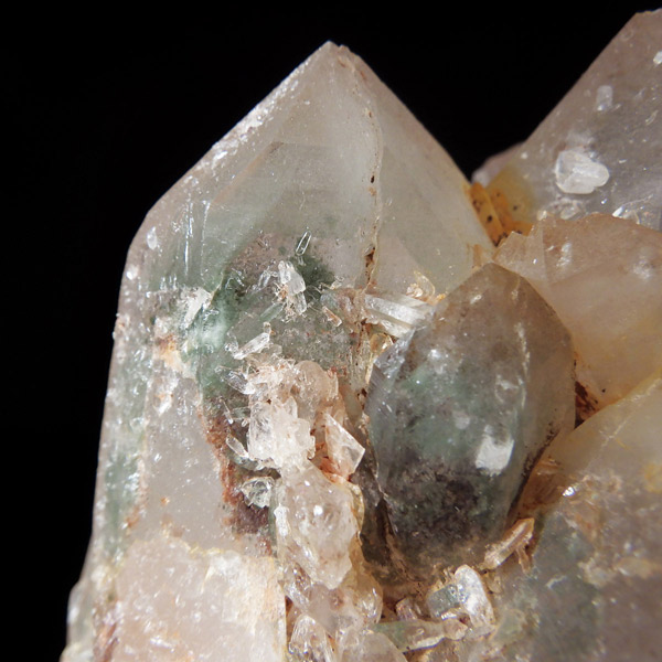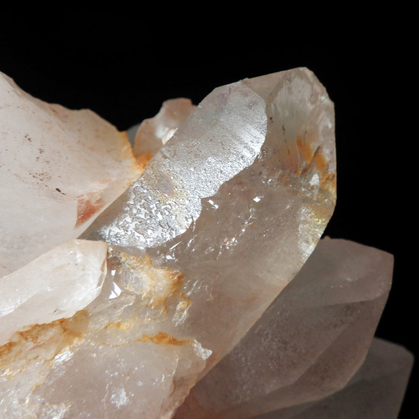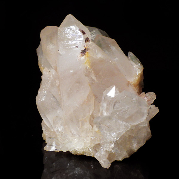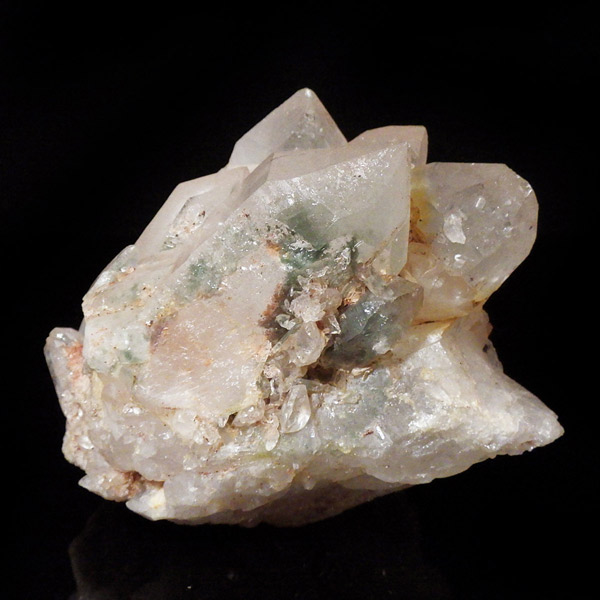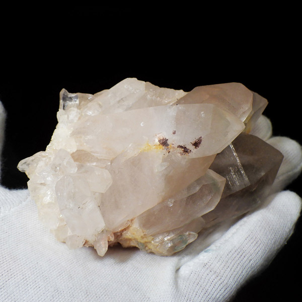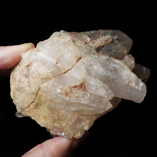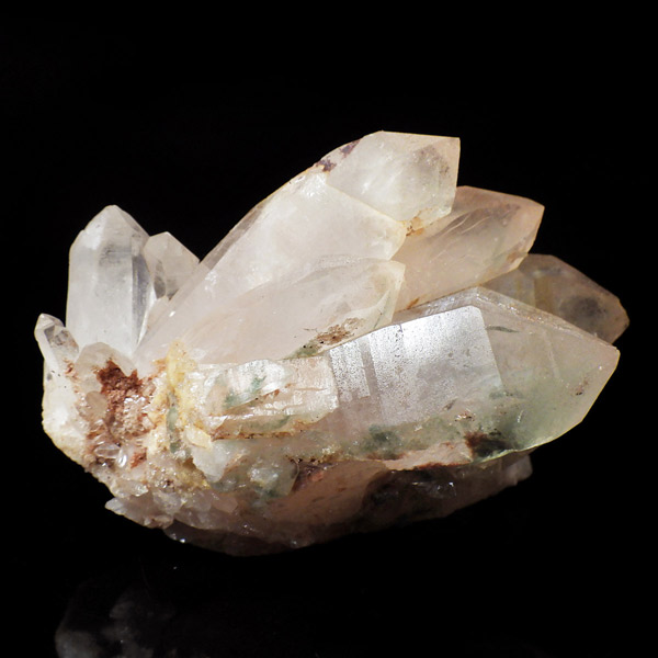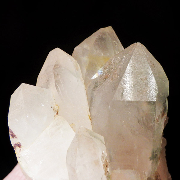 インド・ヒマラヤ山脈にあるマニカラン産の水晶クラスターです。この地で採掘される水晶には表面がピンク、又はグリーンをしたものがよく見られます。ピンク色の水晶といえばローズクォーツが有名ですが、それとは別で土壌に含まれる赤褐色をした酸化鉄により表面や母岩部がピンク色になっています。ほんのりと淡いピンク色や濃いピンク色、オレンジがかったピンク色などそれぞれ微妙に色合いも違います。グリーンはクローライトを内包したものになります。