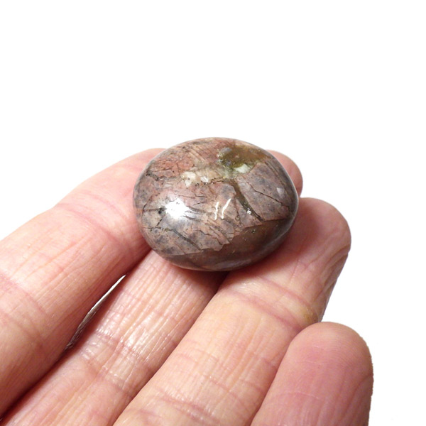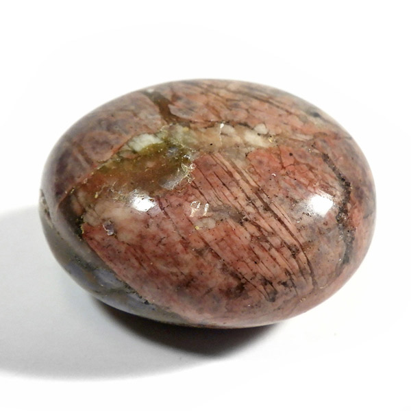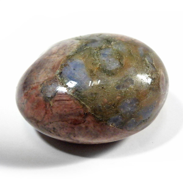 ブラジル産のケセラストーン、タンブルです。ケセラストーン(コングロメレイト)は、スーパーセブンの名付け親でもあるアメリカのクリスタルヒーラー「メロディ女史」が、2008年のツーソンショーにおいて発表した新しいパワーストーンです。ブラジル・バイア州ジュアゼイロ周辺で産出されます。一つの石の中にクォーツ・ブルーオパール・カルサイト・カオリナイト・クリノゾイサイト・マグネタイト・斜長石など、多くの鉱物が混ざり合った状態で産出されます。そのため、様々な色合いが見られ、レンガ色・青色・肌色・茶色などが見え、 その独特の模様は見ていて飽きません。