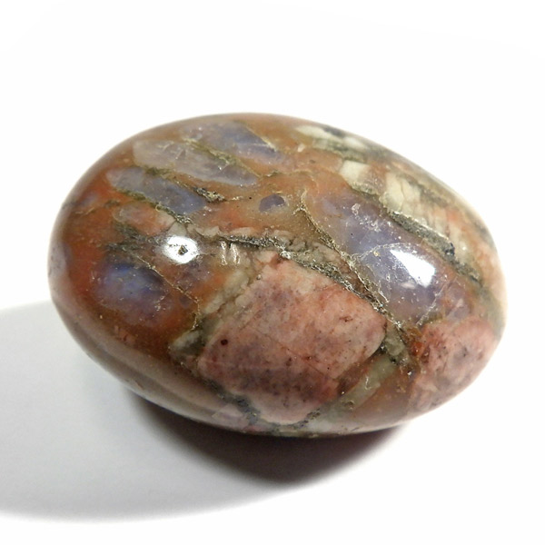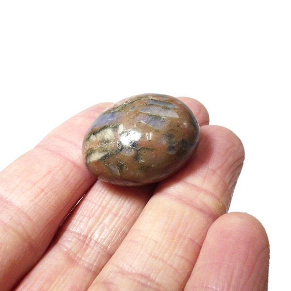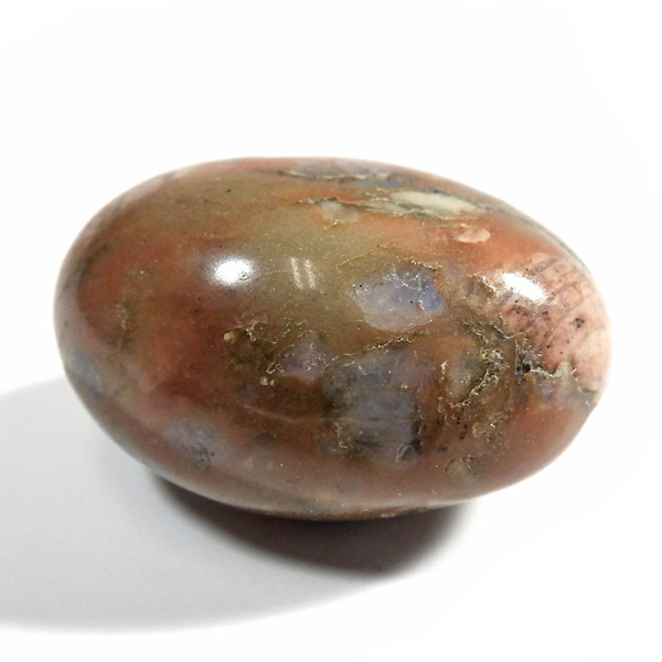 ブラジル産のケセラストーン、タンブルです。ケセラストーン(コングロメレイト)は、スーパーセブンの名付け親でもあるアメリカのクリスタルヒーラー「メロディ女史」が、2008年のツーソンショーにおいて発表した新しいパワーストーンです。ブラジル・バイア州ジュアゼイロ周辺で産出されます。一つの石の中にクォーツ・ブルーオパール・カルサイト・カオリナイト・クリノゾイサイト・マグネタイト・斜長石など、多くの鉱物が混ざり合った状態で産出されます。そのため、様々な色合いが見られ、レンガ色・青色・肌色・茶色などが見え、 その独特の模様は見ていて飽きません。