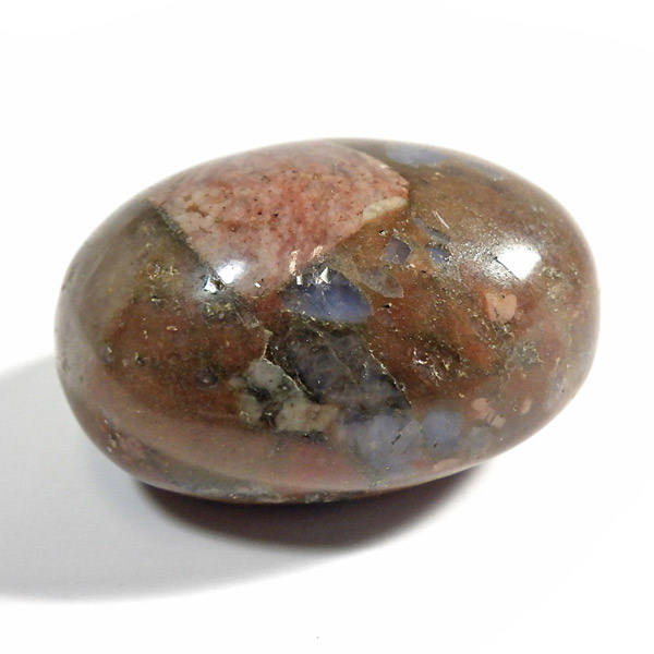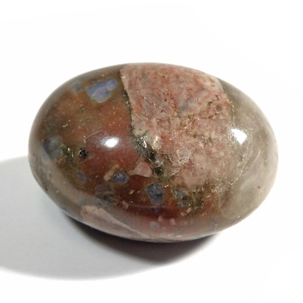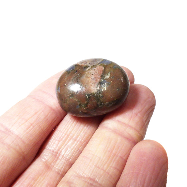 ブラジル産のケセラストーン、タンブルです。ケセラストーン(コングロメレイト)は、スーパーセブンの名付け親でもあるアメリカのクリスタルヒーラー「メロディ女史」が、2008年のツーソンショーにおいて発表した新しいパワーストーンです。ブラジル・バイア州ジュアゼイロ周辺で産出されます。一つの石の中にクォーツ・ブルーオパール・カルサイト・カオリナイト・クリノゾイサイト・マグネタイト・斜長石など、多くの鉱物が混ざり合った状態で産出されます。そのため、様々な色合いが見られ、レンガ色・青色・肌色・茶色などが見え、 その独特の模様は見ていて飽きません。