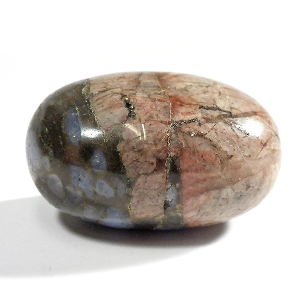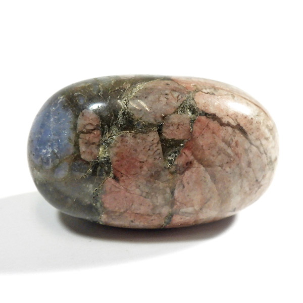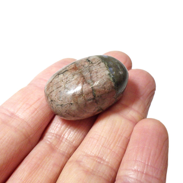 ブラジル産のケセラストーン、タンブルです。ケセラストーン(コングロメレイト)は、スーパーセブンの名付け親でもあるアメリカのクリスタルヒーラー「メロディ女史」が、2008年のツーソンショーにおいて発表した新しいパワーストーンです。ブラジル・バイア州ジュアゼイロ周辺で産出されます。一つの石の中にクォーツ・ブルーオパール・カルサイト・カオリナイト・クリノゾイサイト・マグネタイト・斜長石など、多くの鉱物が混ざり合った状態で産出されます。そのため、様々な色合いが見られ、レンガ色・青色・肌色・茶色などが見え、 その独特の模様は見ていて飽きません。