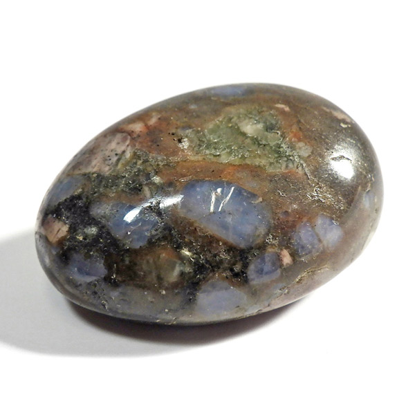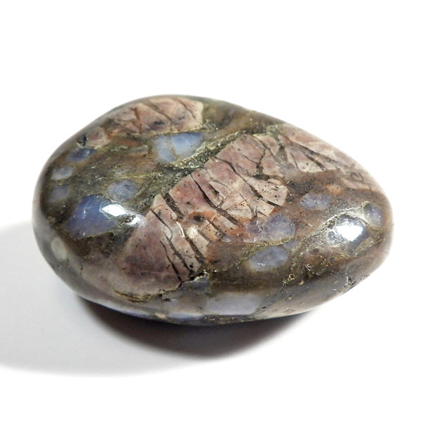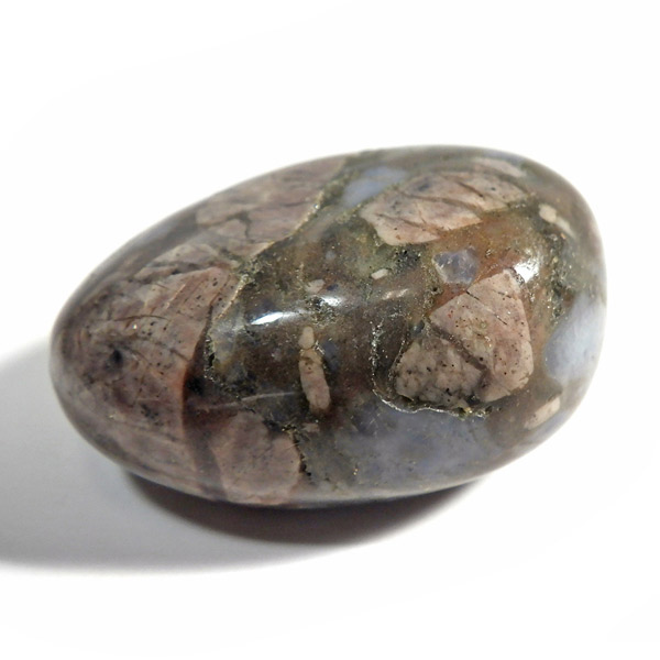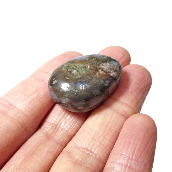 ブラジル産のケセラストーン、タンブルです。ケセラストーン(コングロメレイト)は、スーパーセブンの名付け親でもあるアメリカのクリスタルヒーラー「メロディ女史」が、2008年のツーソンショーにおいて発表した新しいパワーストーンです。ブラジル・バイア州ジュアゼイロ周辺で産出されます。一つの石の中にクォーツ・ブルーオパール・カルサイト・カオリナイト・クリノゾイサイト・マグネタイト・斜長石など、多くの鉱物が混ざり合った状態で産出されます。そのため、様々な色合いが見られ、レンガ色・青色・肌色・茶色などが見え、 その独特の模様は見ていて飽きません。