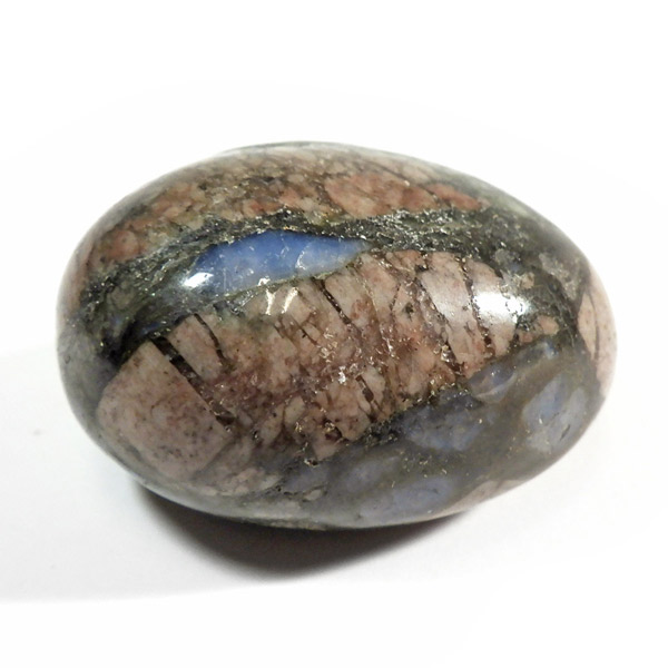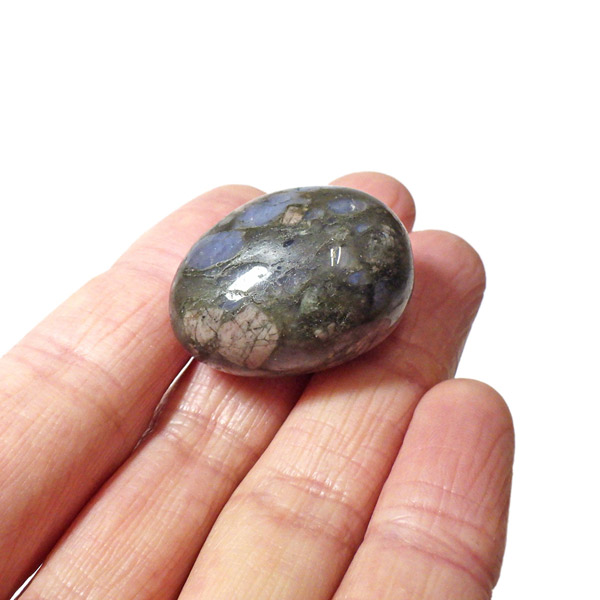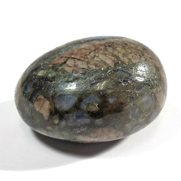 ブラジル産のケセラストーン、タンブルです。ケセラストーン(コングロメレイト)は、スーパーセブンの名付け親でもあるアメリカのクリスタルヒーラー「メロディ女史」が、2008年のツーソンショーにおいて発表した新しいパワーストーンです。ブラジル・バイア州ジュアゼイロ周辺で産出されます。一つの石の中にクォーツ・ブルーオパール・カルサイト・カオリナイト・クリノゾイサイト・マグネタイト・斜長石など、多くの鉱物が混ざり合った状態で産出されます。そのため、様々な色合いが見られ、レンガ色・青色・肌色・茶色などが見え、 その独特の模様は見ていて飽きません。