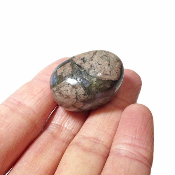 ブラジル産のケセラストーン、タンブルです。ケセラストーン(コングロメレイト)は、スーパーセブンの名付け親でもあるアメリカのクリスタルヒーラー「メロディ女史」が、2008年のツーソンショーにおいて発表した新しいパワーストーンです。ブラジル・バイア州ジュアゼイロ周辺で産出されます。一つの石の中にクォーツ・ブルーオパール・カルサイト・カオリナイト・クリノゾイサイト・マグネタイト・斜長石など、多くの鉱物が混ざり合った状態で産出されます。そのため、様々な色合いが見られ、レンガ色・青色・肌色・茶色などが見え、 その独特の模様は見ていて飽きません。