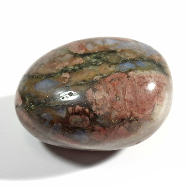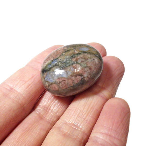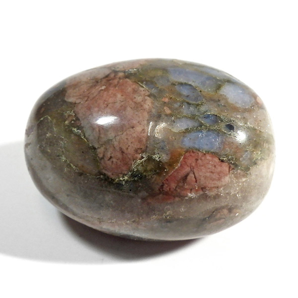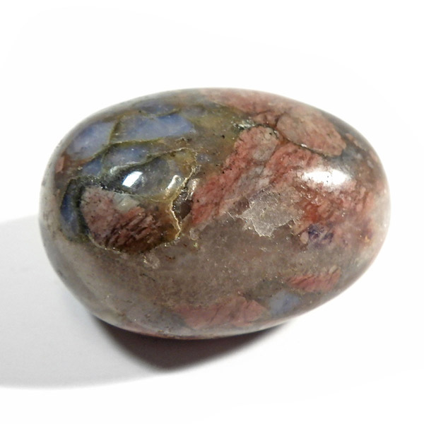 ブラジル産のケセラストーン、タンブルです。ケセラストーン(コングロメレイト)は、スーパーセブンの名付け親でもあるアメリカのクリスタルヒーラー「メロディ女史」が、2008年のツーソンショーにおいて発表した新しいパワーストーンです。ブラジル・バイア州ジュアゼイロ周辺で産出されます。一つの石の中にクォーツ・ブルーオパール・カルサイト・カオリナイト・クリノゾイサイト・マグネタイト・斜長石など、多くの鉱物が混ざり合った状態で産出されます。そのため、様々な色合いが見られ、レンガ色・青色・肌色・茶色などが見え、 その独特の模様は見ていて飽きません。
