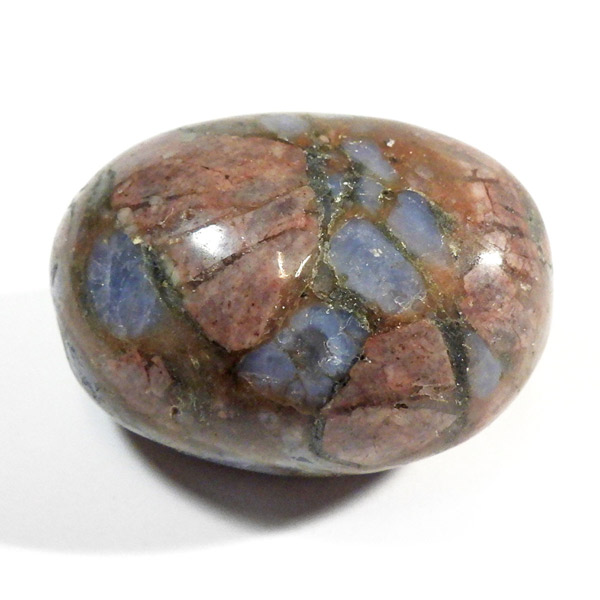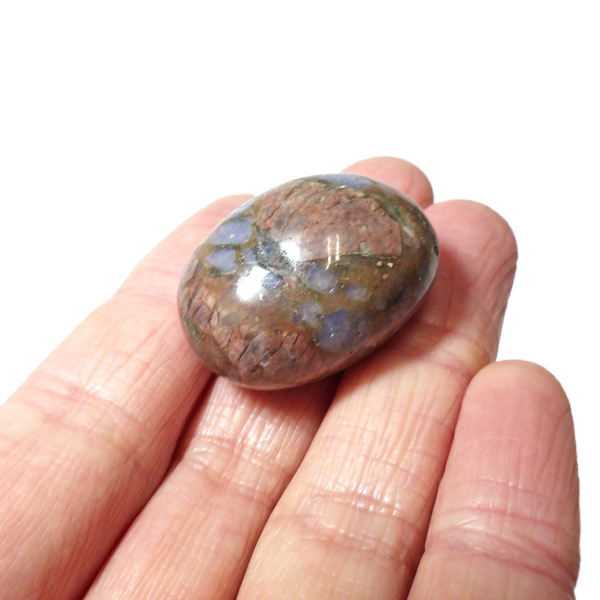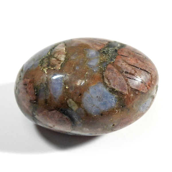 ブラジル産のケセラストーン、タンブルです。ケセラストーン(コングロメレイト)は、スーパーセブンの名付け親でもあるアメリカのクリスタルヒーラー「メロディ女史」が、2008年のツーソンショーにおいて発表した新しいパワーストーンです。ブラジル・バイア州ジュアゼイロ周辺で産出されます。一つの石の中にクォーツ・ブルーオパール・カルサイト・カオリナイト・クリノゾイサイト・マグネタイト・斜長石など、多くの鉱物が混ざり合った状態で産出されます。そのため、様々な色合いが見られ、レンガ色・青色・肌色・茶色などが見え、 その独特の模様は見ていて飽きません。