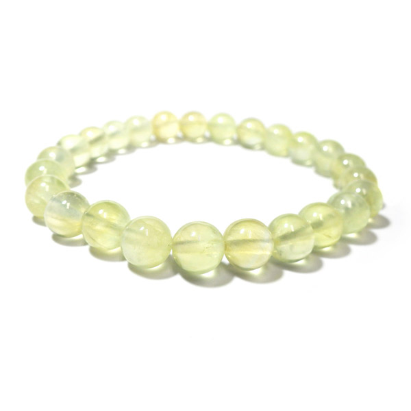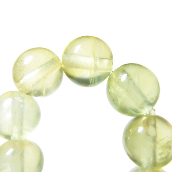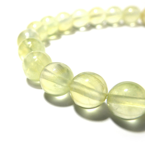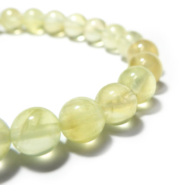 透明感のある爽やかなイエローグリーンのカラーが美しい、プレナイトのブレスレットです。和名を葡萄石というプレナイトはまさにマスカットのようなカラーをしています。透明感のある淡く明るいイエローグリーンの色味で心を落ち付かせてくれそうです。
