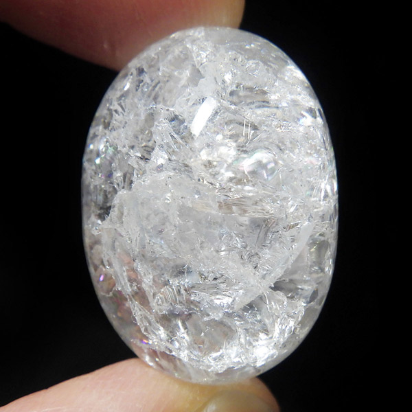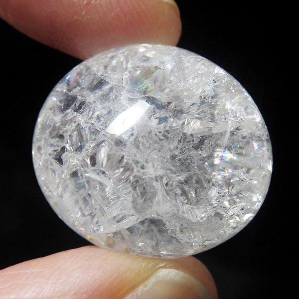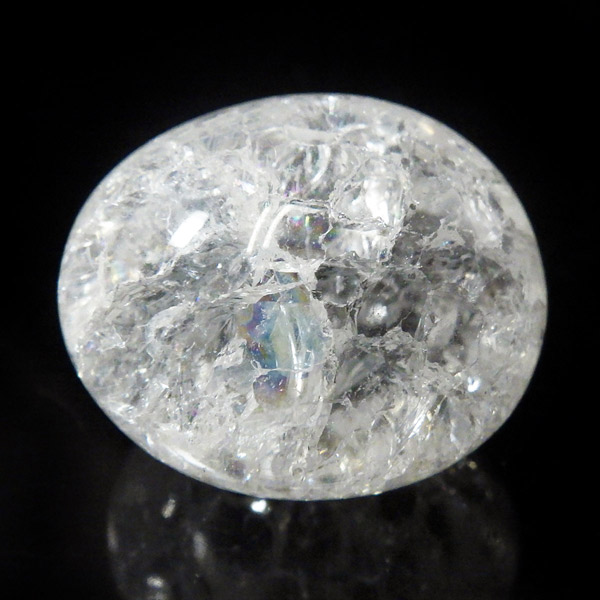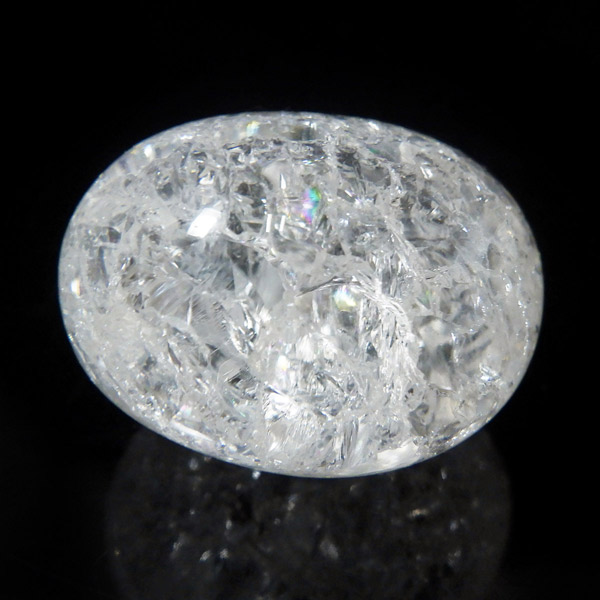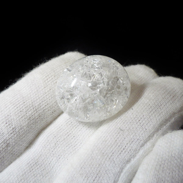 ブラジル産のクラッククォーツ、タンブルです。天然の水晶に人工的にクラック処理を施して作っています。 通常のクリアなクォーツとは異なり、ひび割れ部分が光を乱反射することで、キラッキラッした煌めきと虹色の輝きを見せてくれます。濁りの少ない透明度の良い水晶をしているので、美しさが際立ちます。お部屋に飾ったり、お守りとして持ち運んだり、良い気を運んでくれそうです。