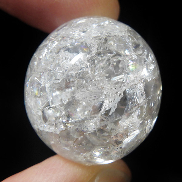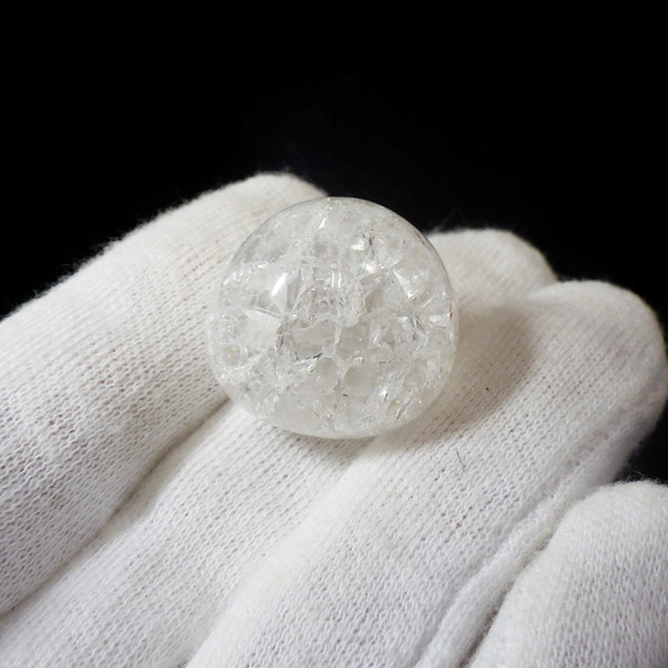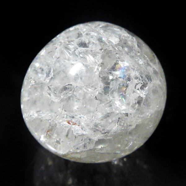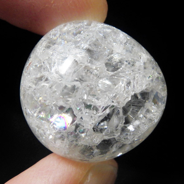 ブラジル産のクラッククォーツ、タンブルです。天然の水晶に人工的にクラック処理を施して作っています。 通常のクリアなクォーツとは異なり、ひび割れ部分が光を乱反射することで、キラッキラッした煌めきと虹色の輝きを見せてくれます。濁りの少ない透明度の良い水晶をしているので、美しさが際立ちます。お部屋に飾ったり、お守りとして持ち運んだり、良い気を運んでくれそうです。