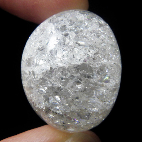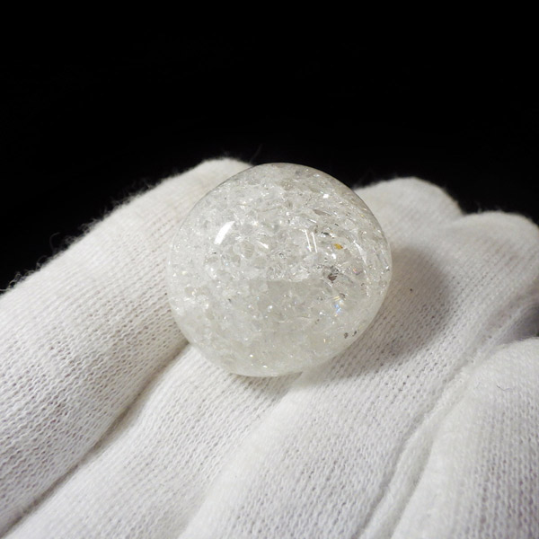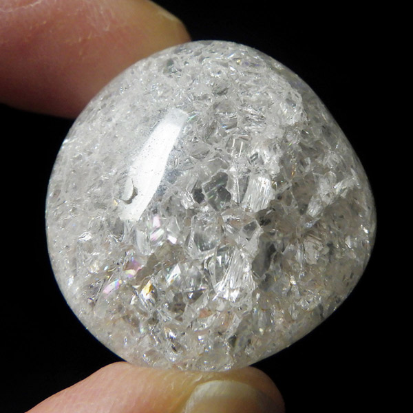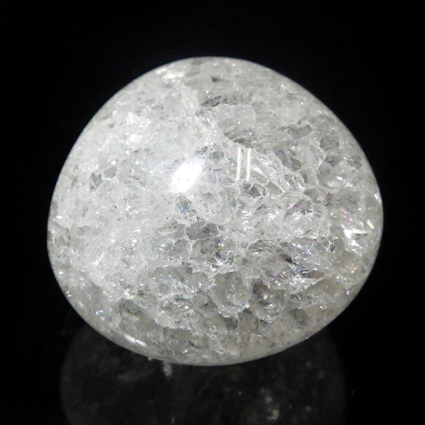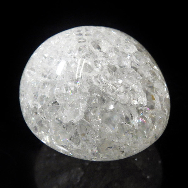 ブラジル産のクラッククォーツ、タンブルです。天然の水晶に人工的にクラック処理を施して作っています。 通常のクリアなクォーツとは異なり、ひび割れ部分が光を乱反射することで、キラッキラッした煌めきと虹色の輝きを見せてくれます。濁りの少ない透明度の良い水晶をしているので、美しさが際立ちます。お部屋に飾ったり、お守りとして持ち運んだり、良い気を運んでくれそうです。