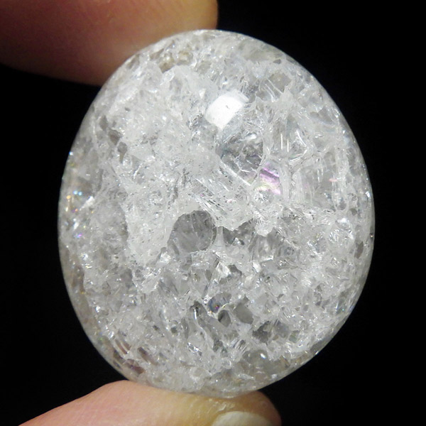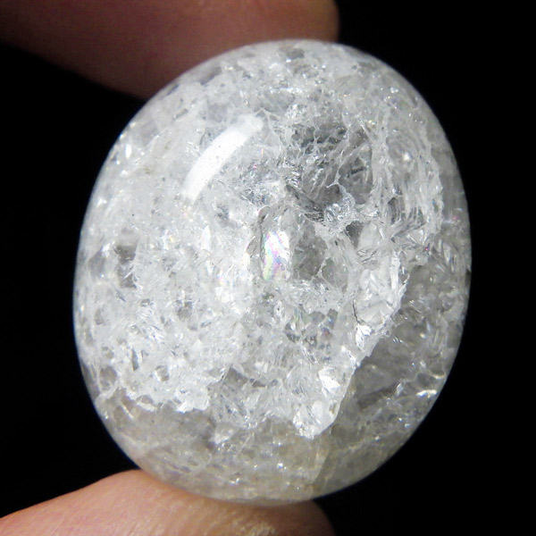 ブラジル産のクラッククォーツ、タンブルです。天然の水晶に人工的にクラック処理を施して作っています。 通常のクリアなクォーツとは異なり、ひび割れ部分が光を乱反射することで、キラッキラッした煌めきと虹色の輝きを見せてくれます。濁りの少ない透明度の良い水晶をしているので、美しさが際立ちます。お部屋に飾ったり、お守りとして持ち運んだり、良い気を運んでくれそうです。
