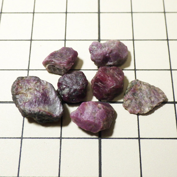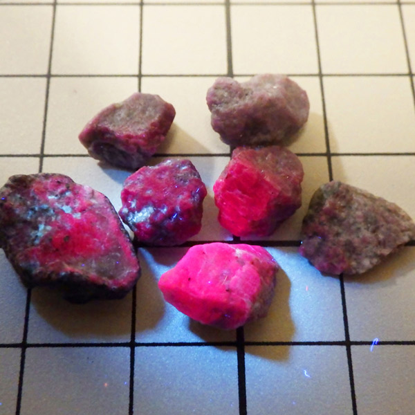 限られた鉱脈から採掘される、貴重なルビーの小さな原石を複数個詰め合わせています。ルビーは宝石名で赤色のコランダム(鋼玉)のことをルビーと呼びます。その他の色のコランダムは全てサファイアになります。ルビーの結晶が小さいのは、赤い色の原因である微量のクロムが結晶成長を妨げるためで、赤色のルビーのみ飛びぬけて貴重になります。ブラックライトを照射することでルビーレッドが鮮やかに蛍光します。